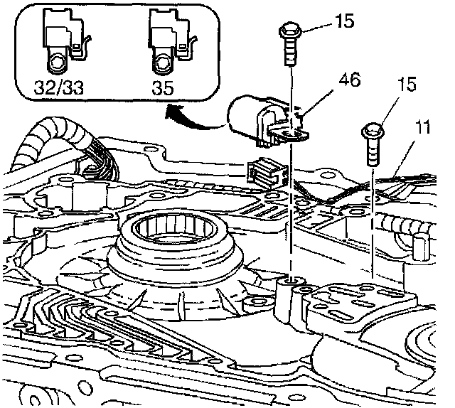 2. Remove the input speed sensor bolt (15) and the input speed sensor (46).