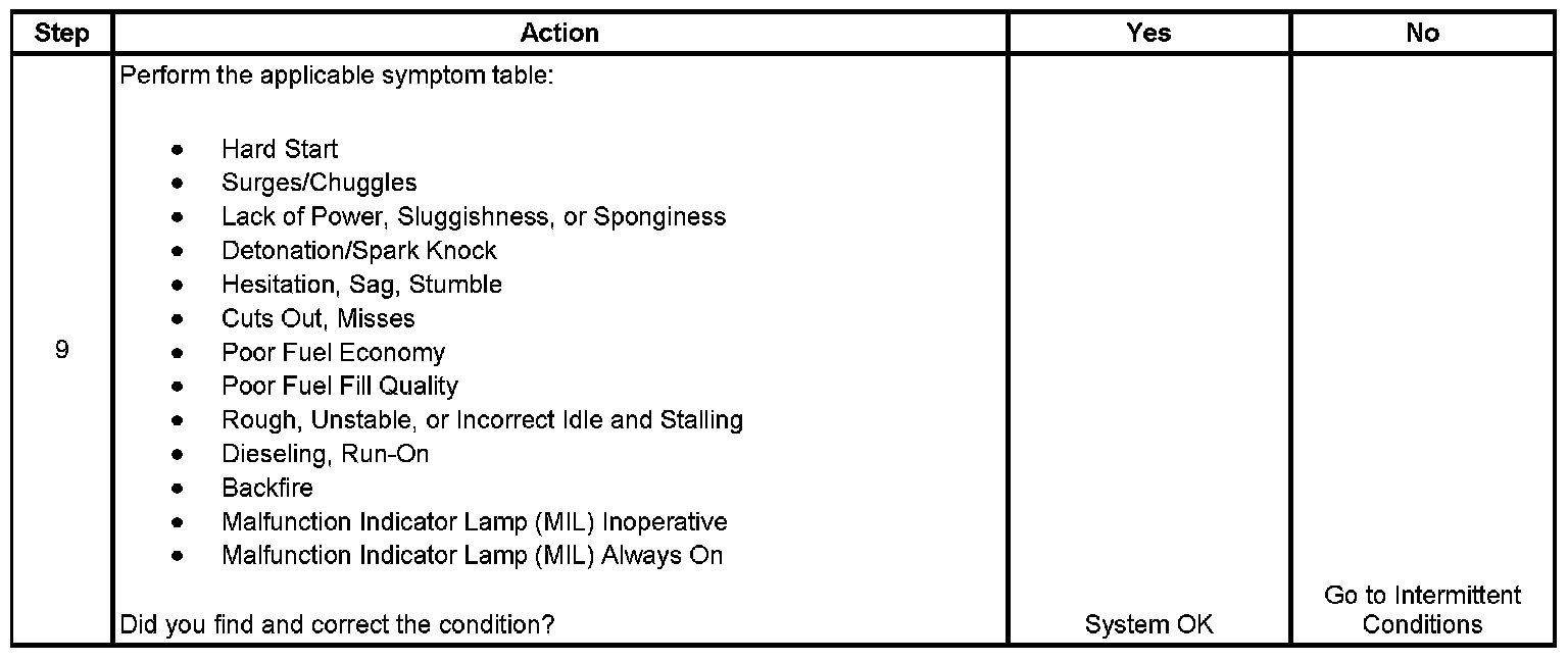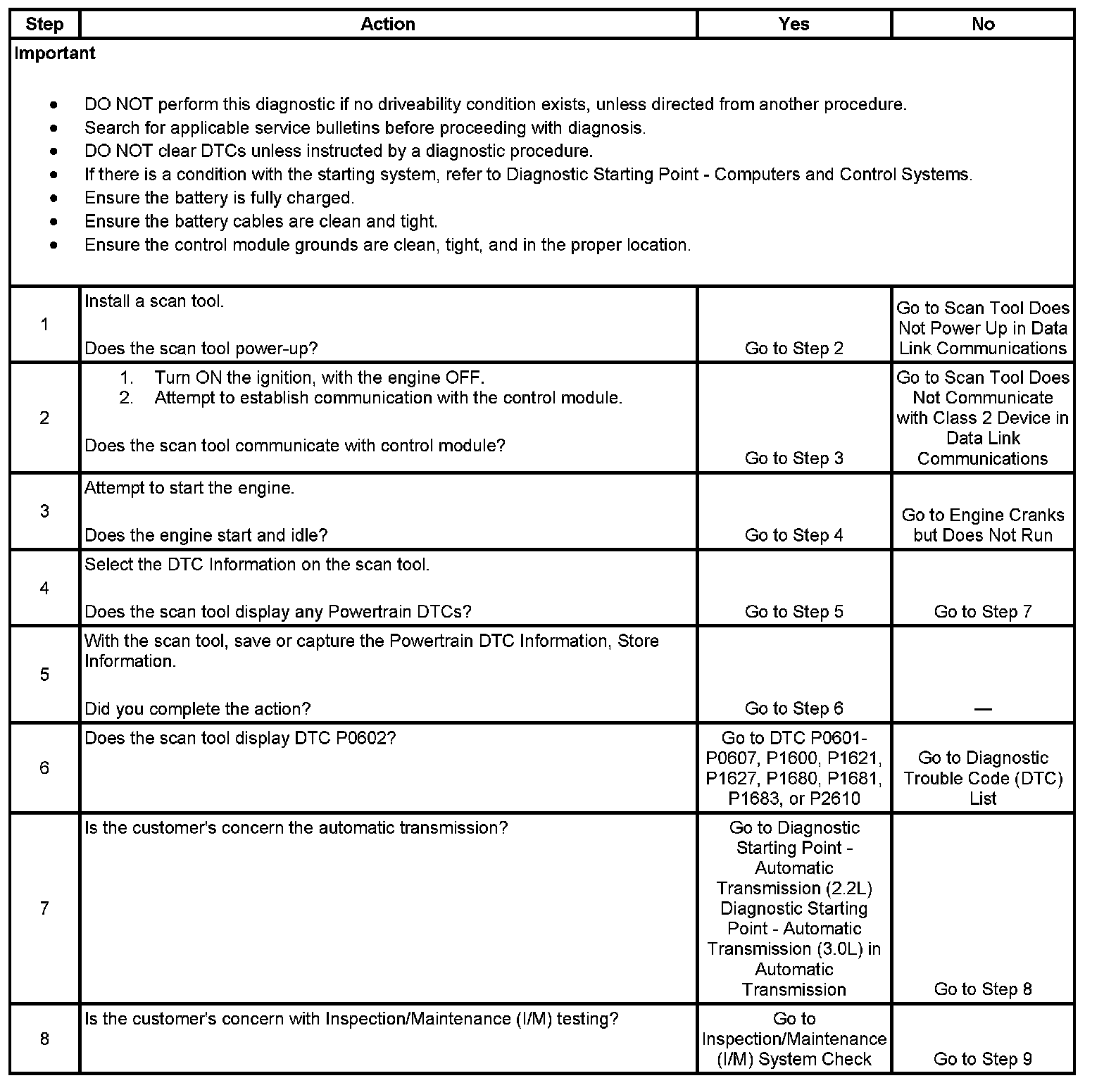 The Diagnostic System Check - Computers and Control Systems is an organized approach to identifying a condition that is created by a malfunction in the engine control system. The Diagnostic System Check must be the starting point for any driveability concern. The Diagnostic System Check directs the service technician to the next logical step in order to diagnose the concern. Understanding and correctly using the diagnostic table reduces diagnostic time and prevents the replacement of good parts.