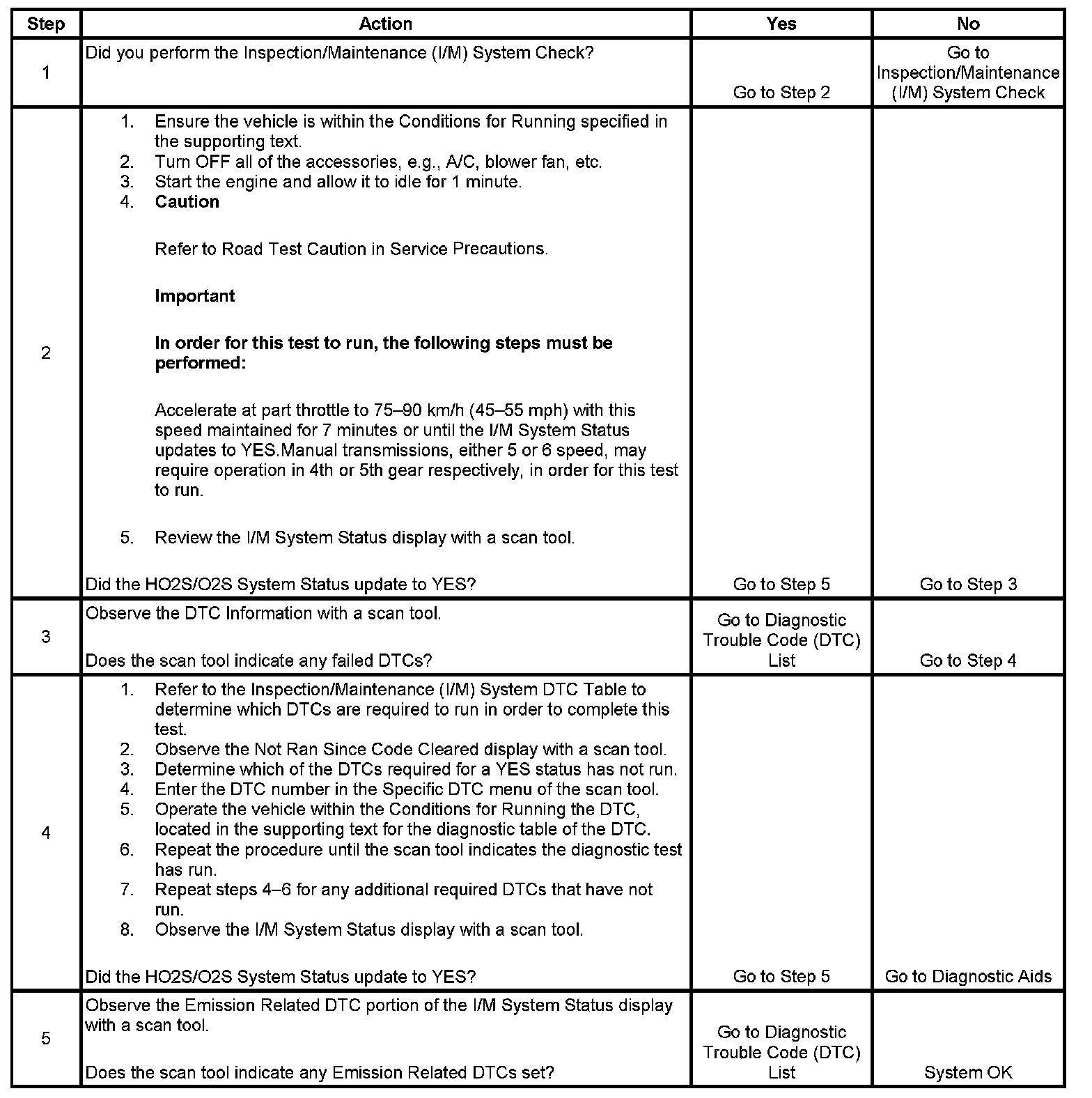 The purpose of this test is to satisfy the enable criteria necessary to execute Inspection/Maintenance (I/M) readiness diagnostics for the heated oxygen sensor/oxygen sensor (HO2S/O2S) system. The test may be used to set the I/M System Status indicators to YES. The I/M System Status display on the scan tool indicates whether or not the control module has completed the required test. The required test is complete when either all of the DTCs comprising the test have run and passed, or when any one of the DTCs comprising the test has illuminated the malfunction indicator lamp (MIL). Once the test is complete, the I/M System Status display will indicate YES in the completed column.