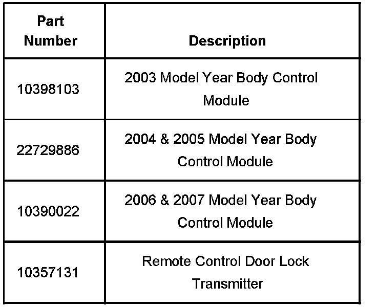 The purpose of this bulletin is to provide the service procedure for adding RKE to ION.2 vehicles not equipped with RKE as original equipment. The parts required to perform this procedure are a service body control module (BCM) and key fobs. The service BCM contains the necessary hardware to allow the RKE to function. This service BCM is the production part used in ION.2 vehicles with the convenience package and in all ION.3 vehicles. ION.1 vehicles do not have power door locks; therefore, adding RKE to ION.1 vehicles is not possible.