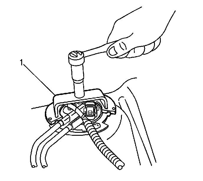 5. Using the SA9156E, or J 39765 (1), carefully rotate to release the fuel pump module retaining lock ring.