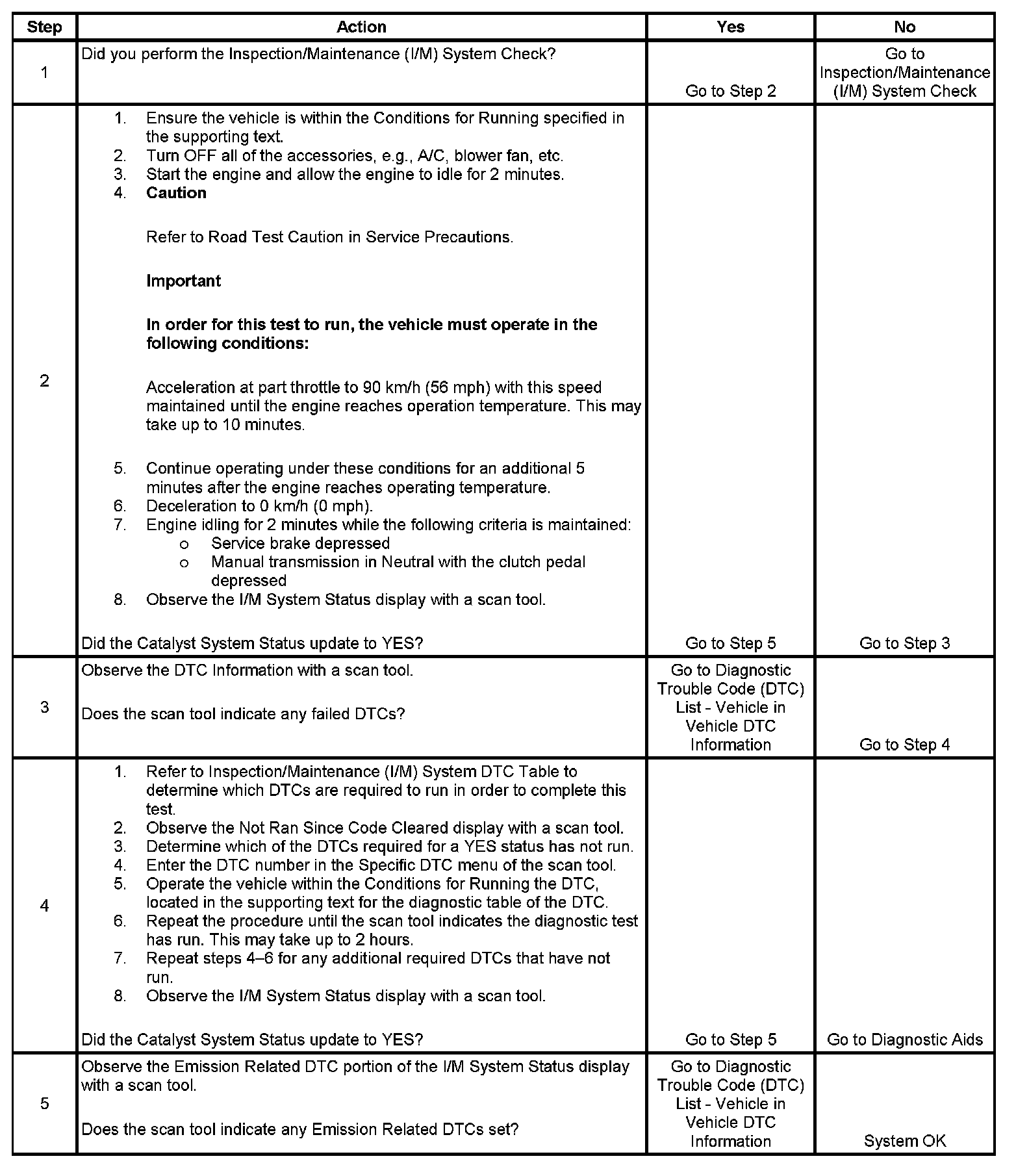 The purpose of this procedure is to satisfy the enable criteria necessary in order to execute the inspection/maintenance (I/M) readiness diagnostics for the Catalyst System. Ensure the vehicle meets the requirements listed in Conditions for Running before performing this test. Failure to meet the necessary requirements may produce inaccurate test results.