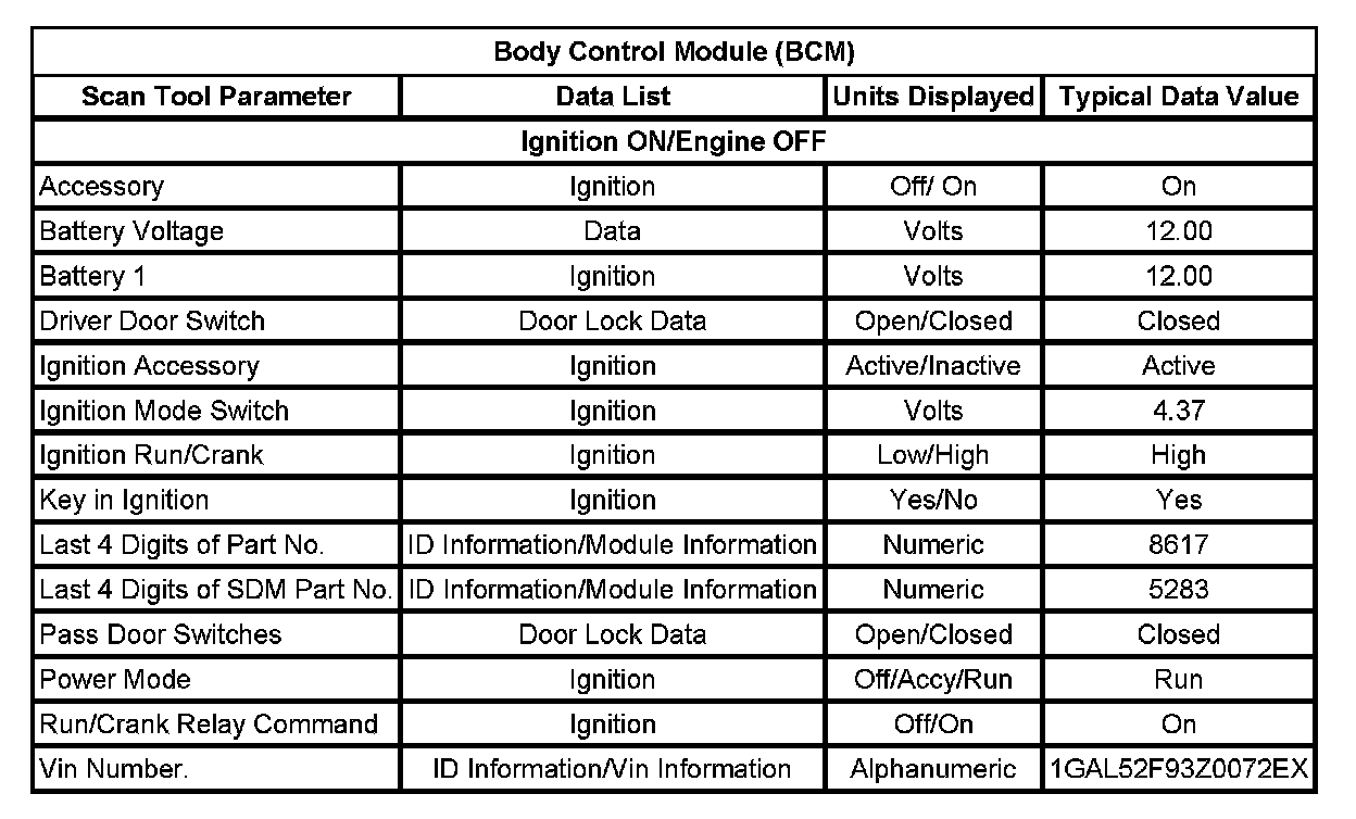 Scan Tool Data List - Body Control Module (BCM):