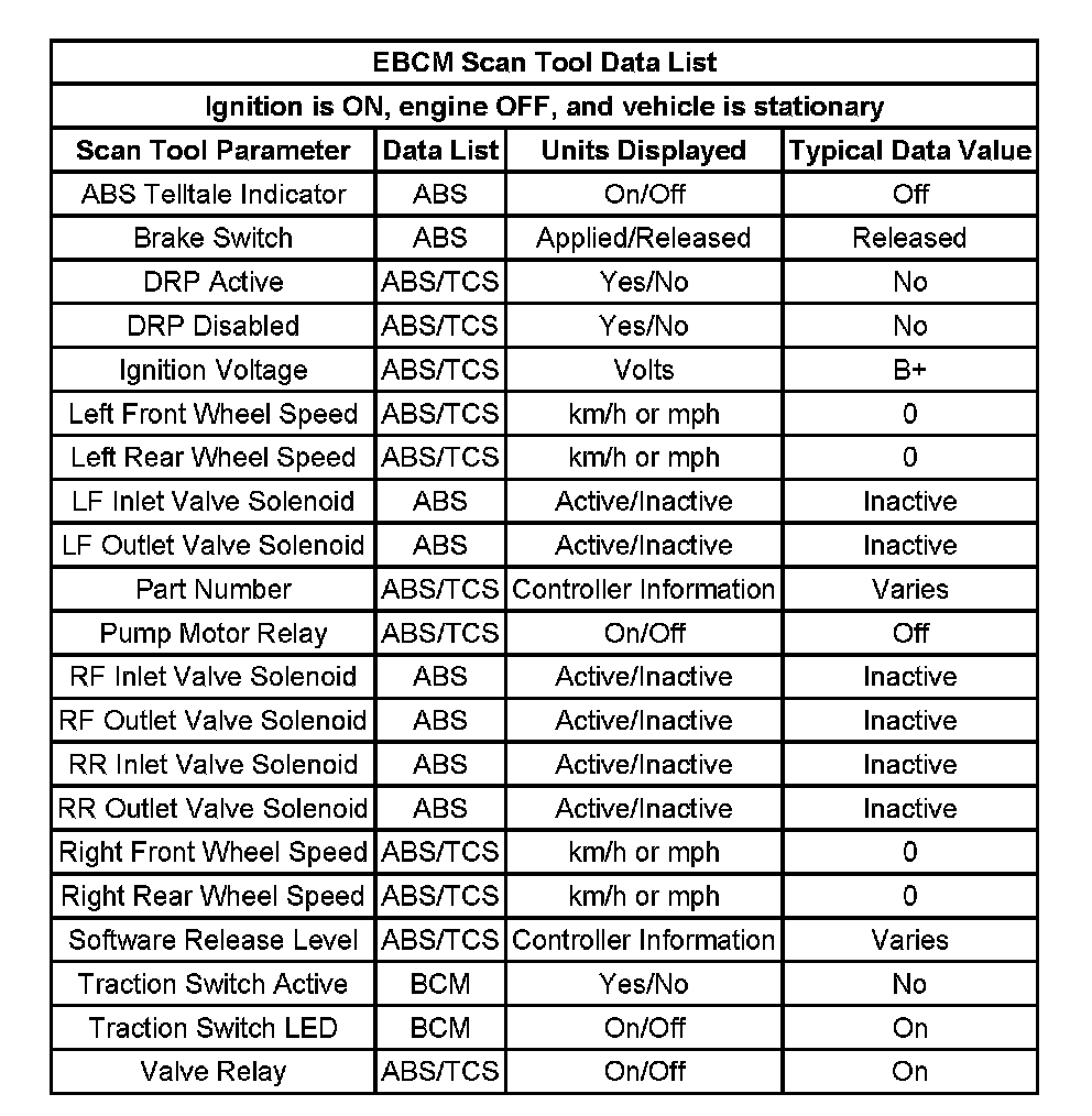 Use the EBCM Scan Tool Data Lists as directed by a diagnostic table or in order to supplement the diagnostic procedures. Begin all the diagnostic procedures with the ABS Diagnostic Starting Point. Use the EBCM Scan Tool Data Lists only after determining: