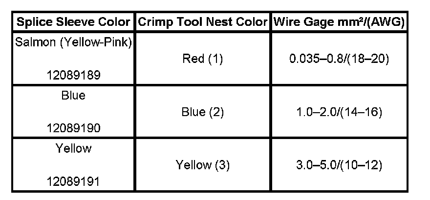 4. Select the proper duraseal splice sleeve according to the wire size. Refer to the above table at the beginning of the repair procedure for the color coding of the duraseal splice sleeves and the crimp tool nests.
