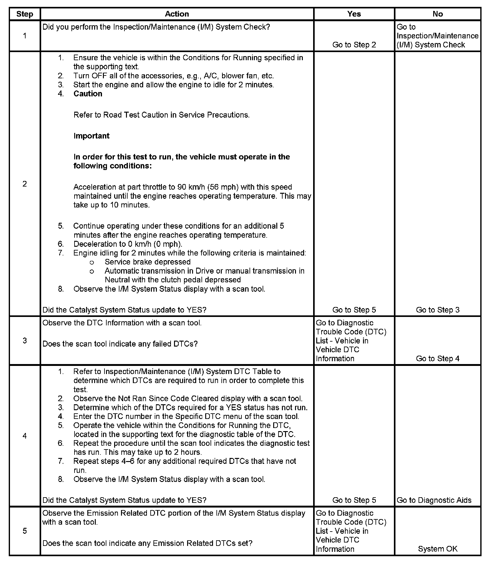 The purpose of this test is to satisfy the enable criteria necessary to execute inspection and maintenance (I/M) readiness diagnostics for the catalyst system. The test may be used to set the I/M System Status indicators to YES. The I/M System Status Display on the scan tool provides an indication of whether the control module has completed the required tests. I/M System Status does not indicate that the tests have passed or failed. When all of the diagnostics for a specific system have run and passed I/M System Status will update to YES. If a test for a specific system has failed, the I/M System Status will update to YES, indicating a determination was made, even if all of the other tests for that system have not run.