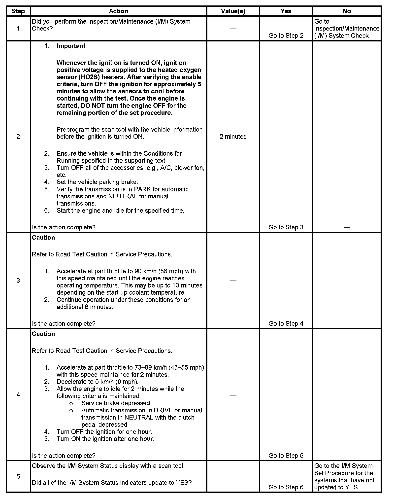 The purpose of the inspection and maintenance (I/M) Complete System Set Procedure is to satisfy the enable criteria necessary to execute all of the I/M readiness diagnostics, and complete the drive cycles for those particular diagnostics. When all diagnostic tests are completed, the I/M System Status indicators are set to YES. Perform this procedure when more than one of the I/M System Status indicators are set to NO.