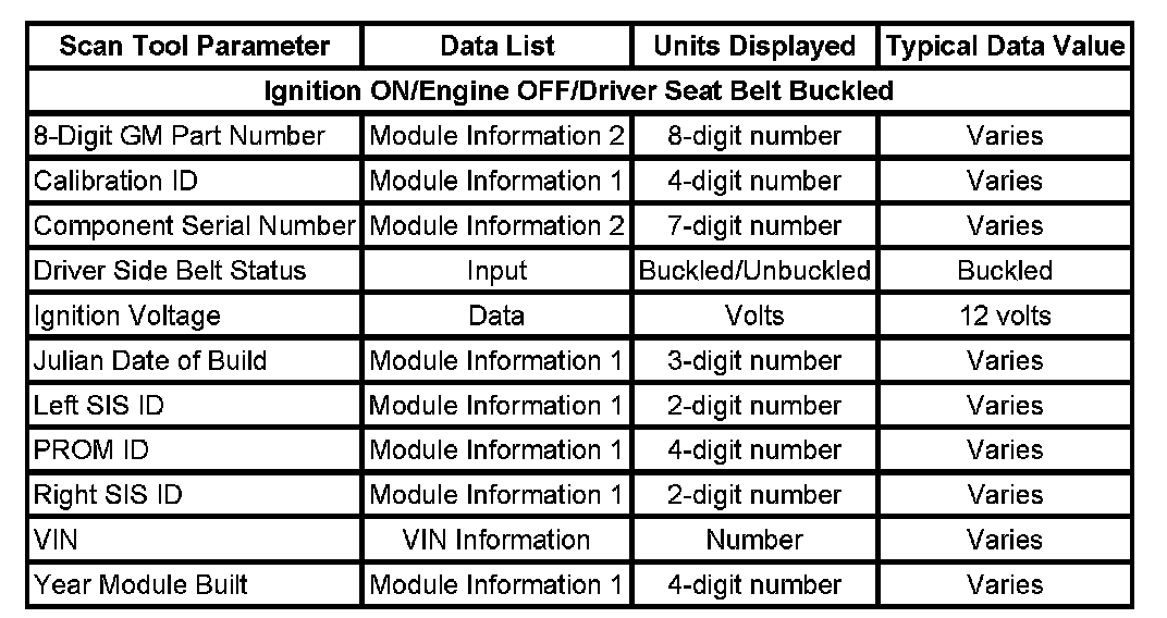 Use the SIR scan tool data list as directed by a diagnostic table or in order to supplement the diagnostic procedures. Begin all of the diagnostic procedures with the Diagnostic System Check - Restraint Systems. Use the SIR scan tool data list after the following is determined: