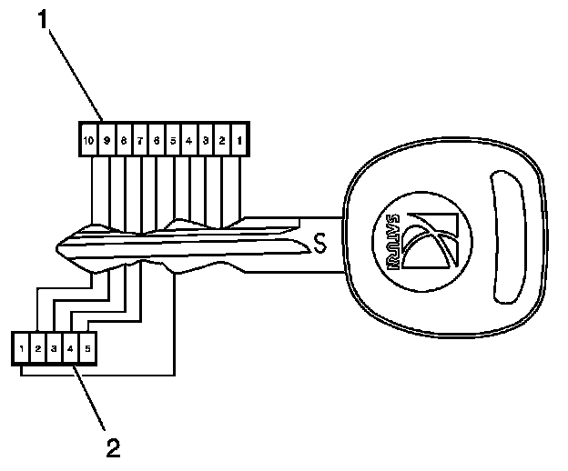 The keys that are furnished with the vehicle are master keys and will operate all the locks on the vehicle. The keys are double sided and reversible. The keys have 10 cut positions (1) with five different depths (2).