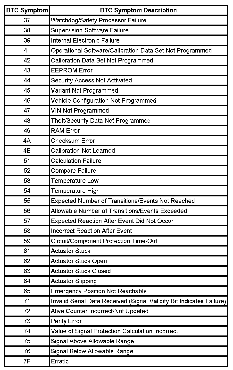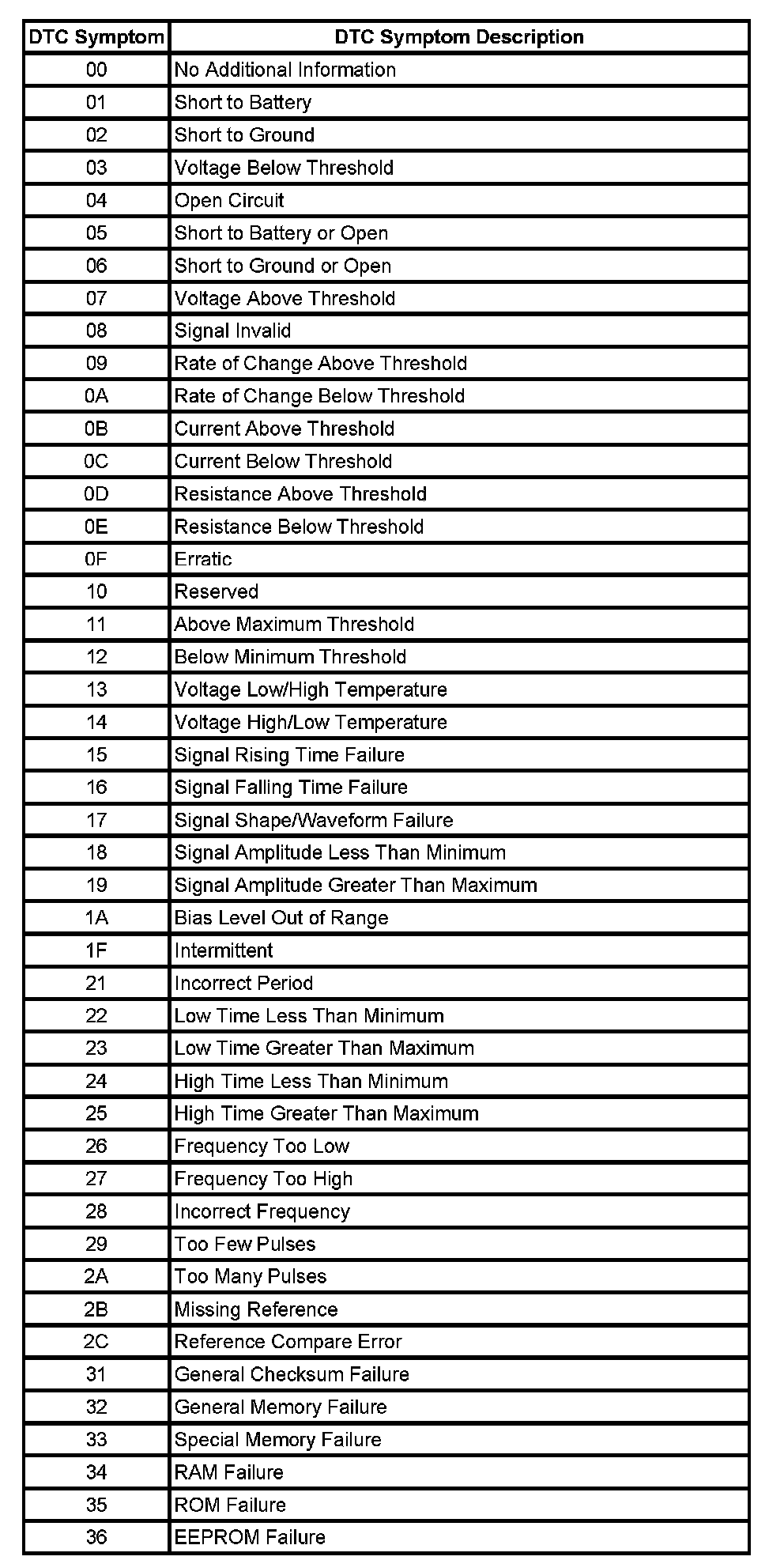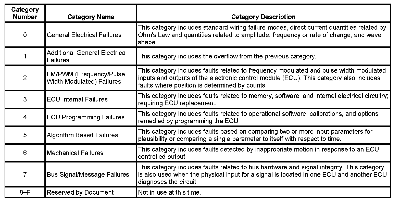 The DTC symptom is made up of 2 alphanumeric digits. The first digit following the DTC indicates the DTC symptom category. There are 16 possible categories available in the range of 0 through the letter F. Currently there are 8 categories in use, 0 through 7. These 8 categories together with their definitions are given below.