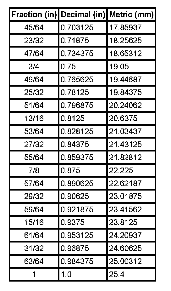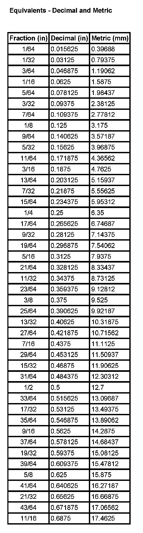 Equivalents - Decimal And Metric