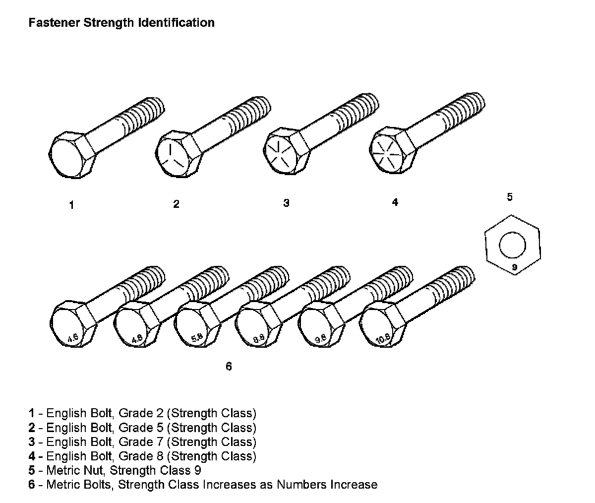 The most commonly used metric fastener strength property classes are 9.8 and 10.9. The class identification is embossed on the head of each bolt. The English, inch strength classes range from grade 2 to grade 8. Radial lines are embossed on the head of each bolt in order to identify the strength class. The number of lines on the head of the bolt is 2 lines less than the actual grade. For example, a grade 8 bolt will have 6 radial lines on the bolt head. Some metric nuts are marked with a single digit strength identification number on the nut face.
