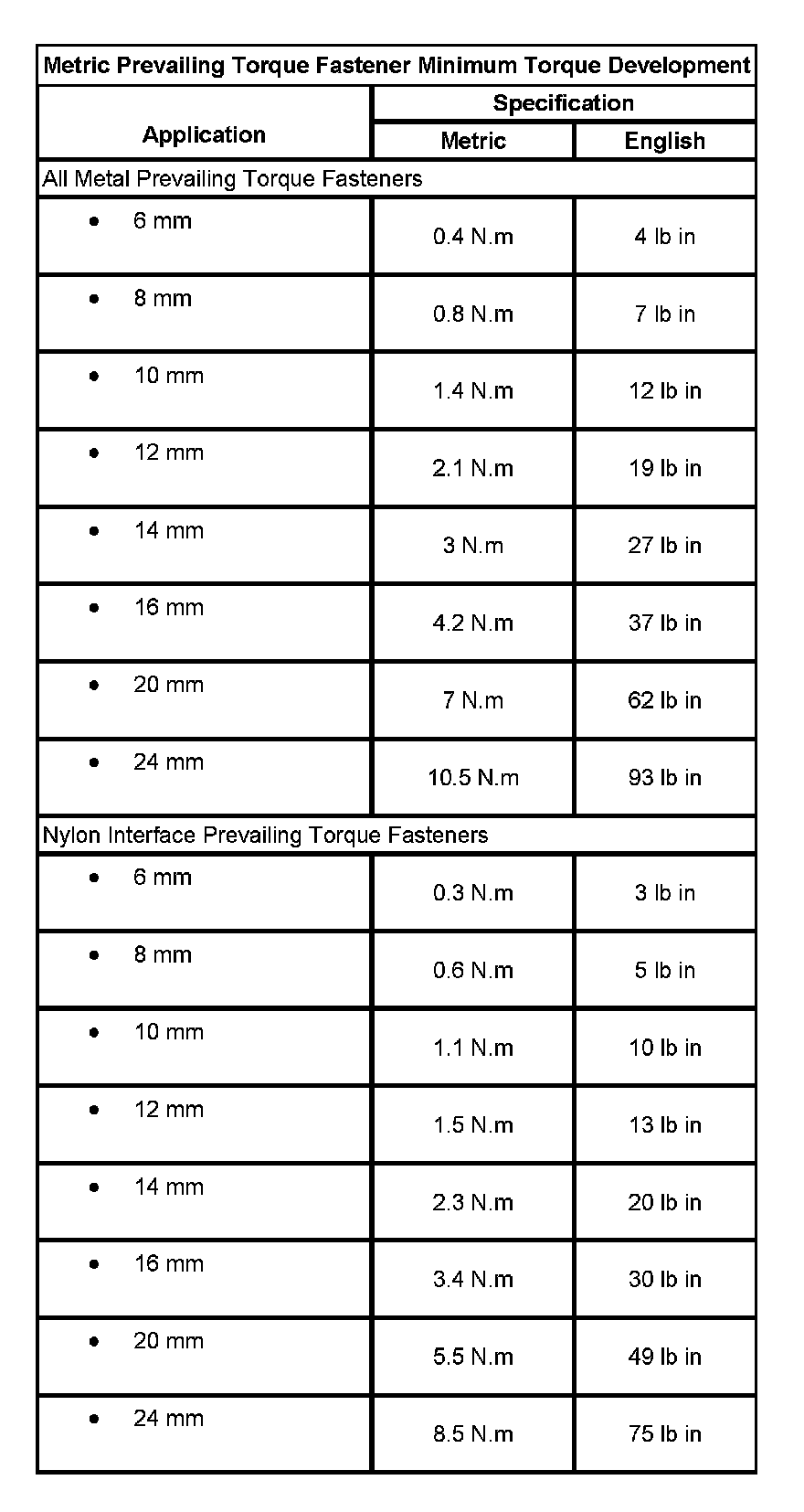 Metric Prevailing Torque Fastener Minimum Torque Development: