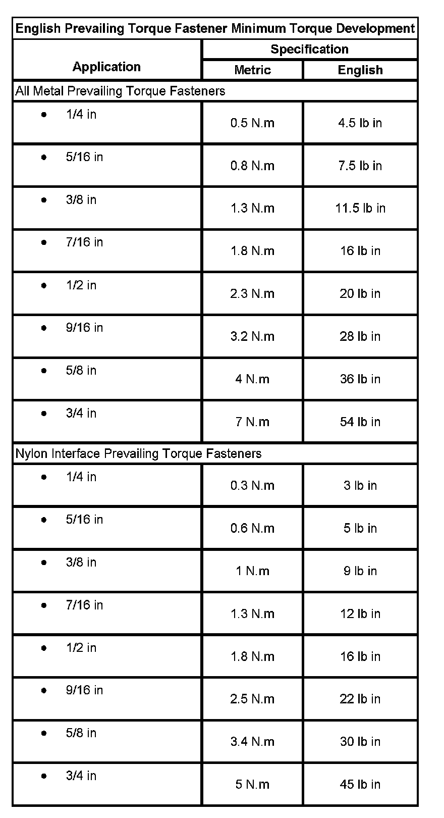 ENGLISH PREVAILING TORQUE FASTENER MINIMUM TORQUE DEVELOPMENT