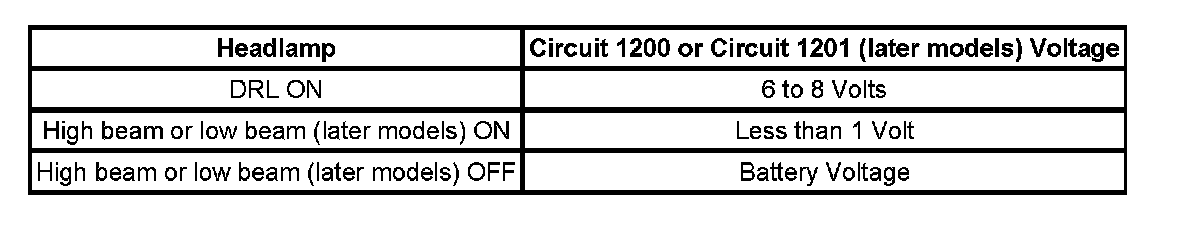 Daytime running lamps (DRL) are controlled by the BCM based on input from the high beam headlamp circuit 1200, the low beam headlamp circuit 1201, the parking brake circuit 1134 and ignition switch state.