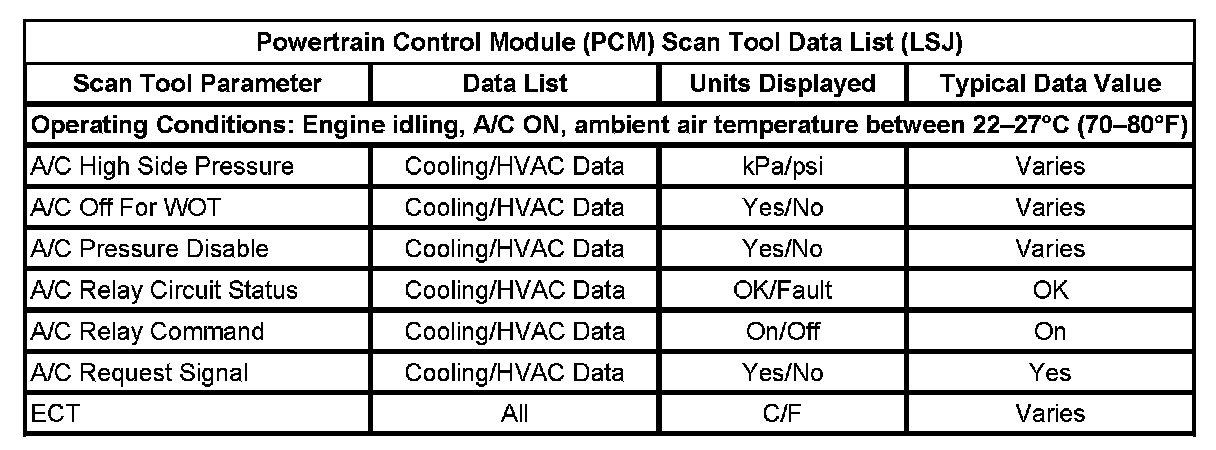 Powertrain Control Module (PCM) Scan Tool Data List:
