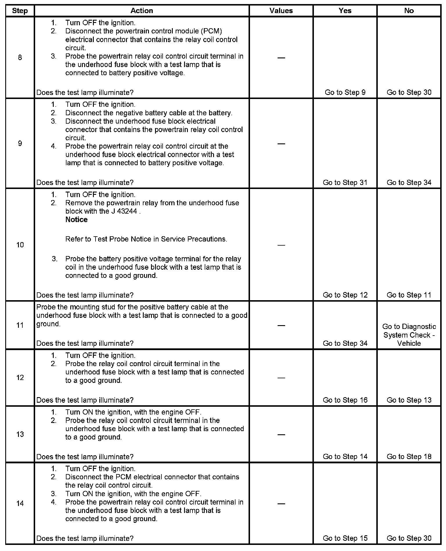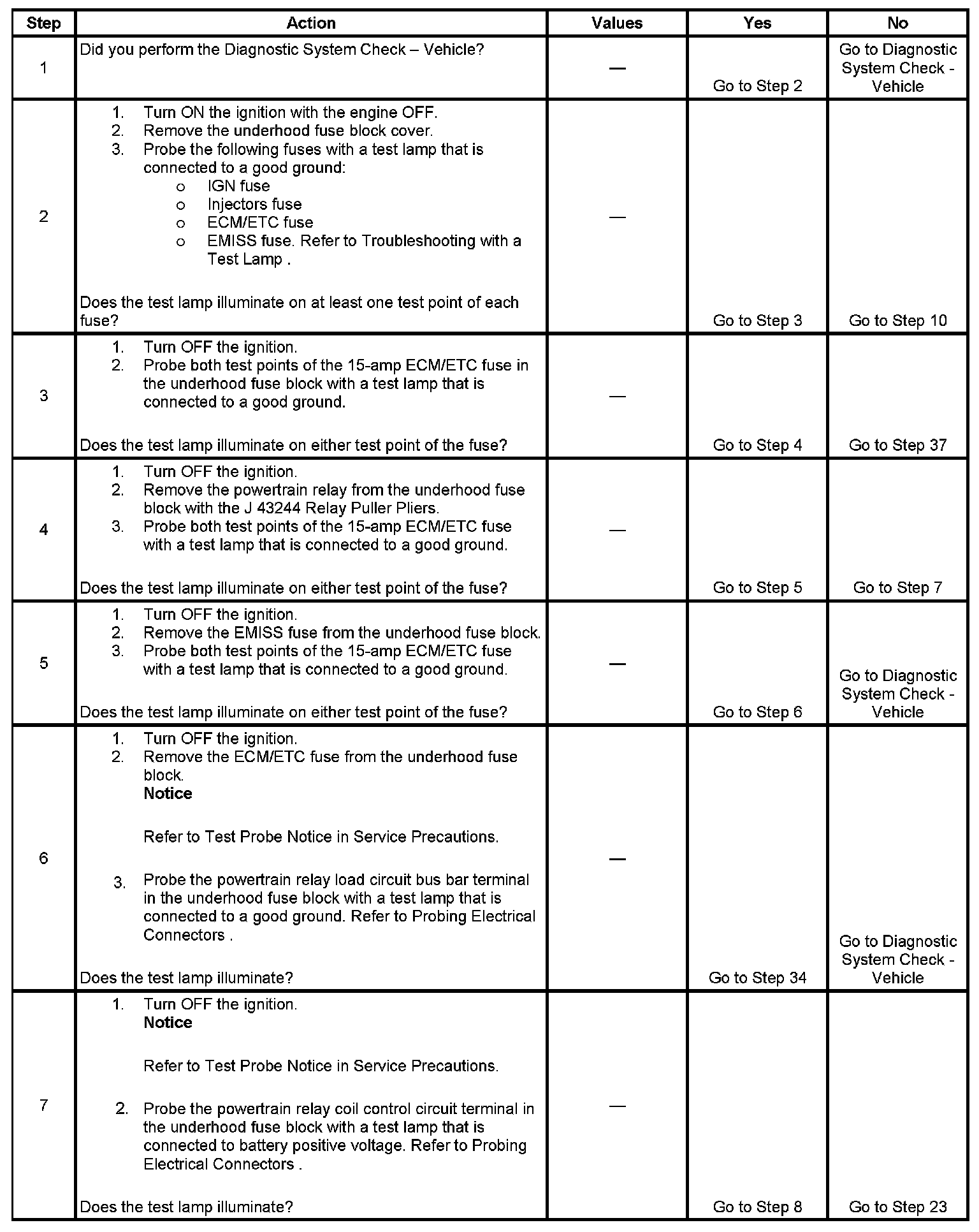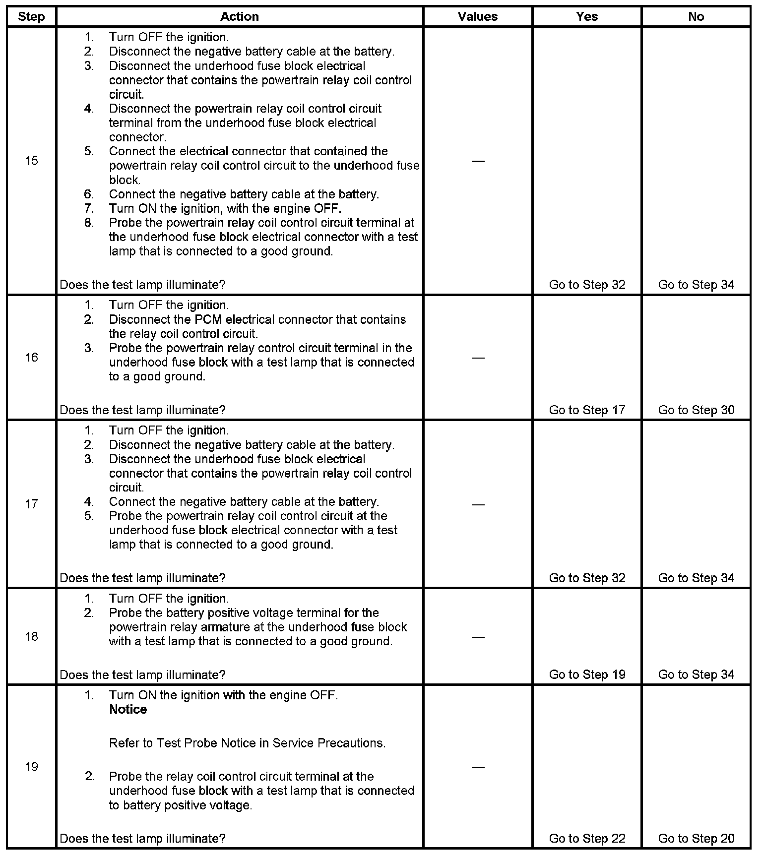 The powertrain relay system diagnosis table assumes that the vehicle battery is fully charged. Refer to Battery Inspection/Test. Battery Inspection/Test