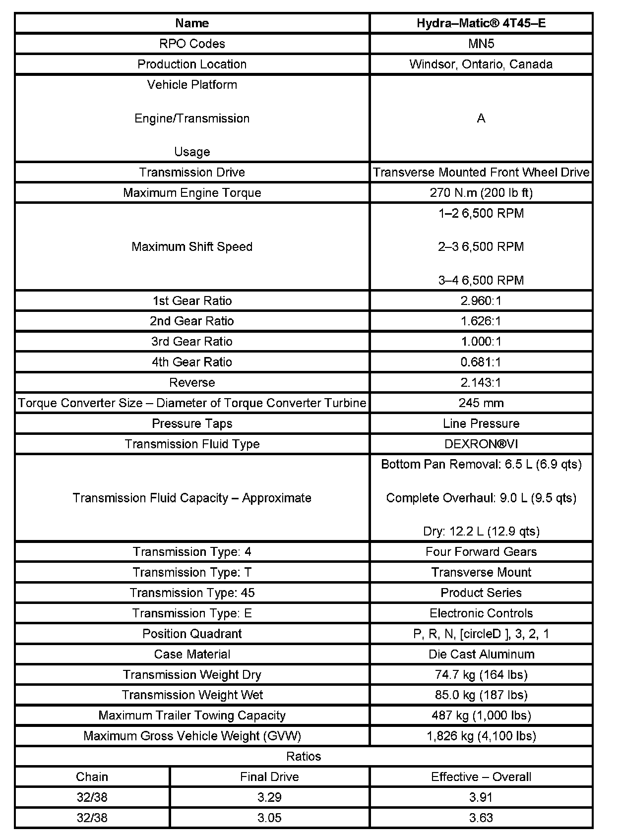 Transmission General Specifications: