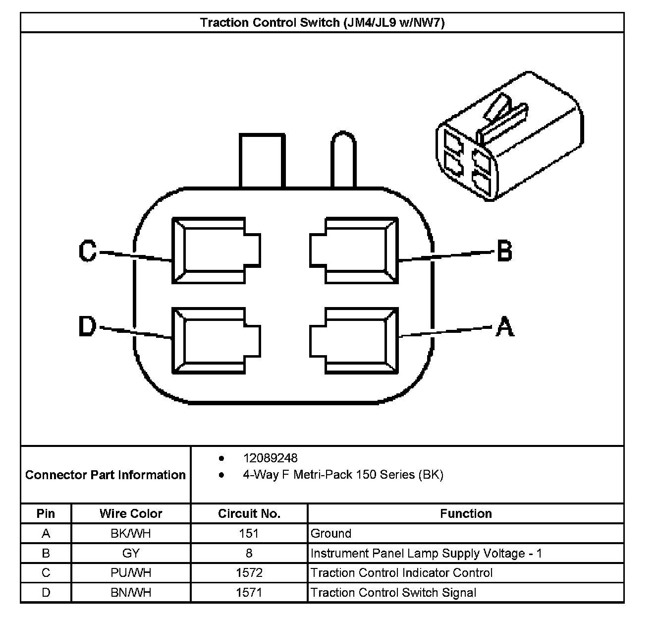 Traction Control Switch With RPO Code JM4/JL9 W/NW7 4-Way Connector End View: