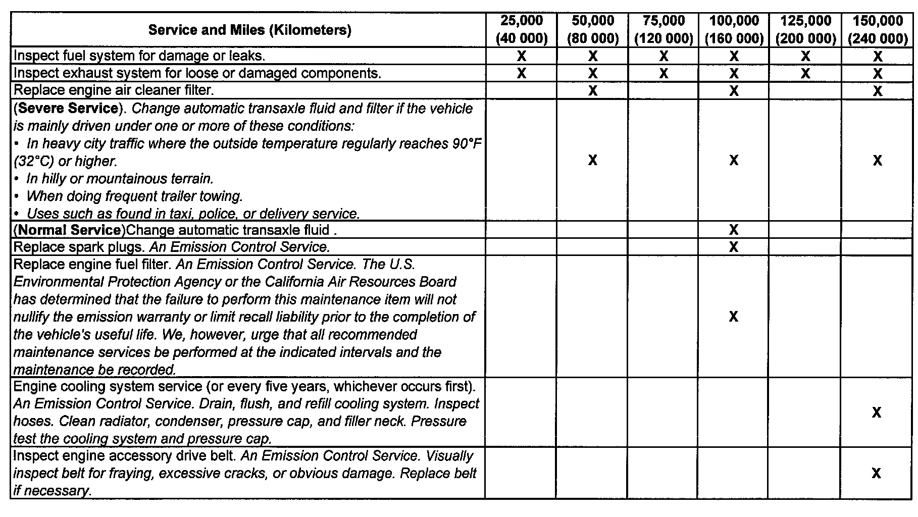 service (I or II) after the indicated miles (kilometers) shown for each item.