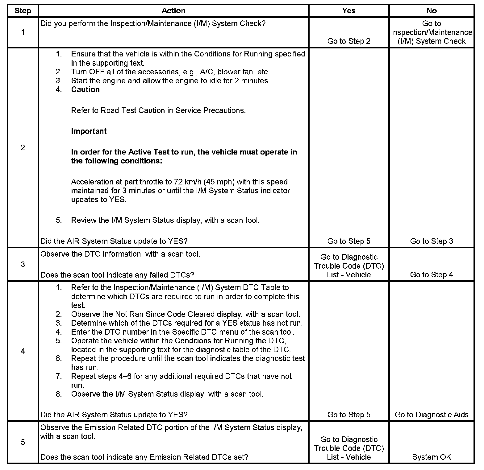 The purpose of this test is to satisfy the enable criteria necessary to execute inspection/maintenance (I/M) readiness diagnostics for the secondary air injection (AIR) system. The test may be used to set the I/M System Status to YES.