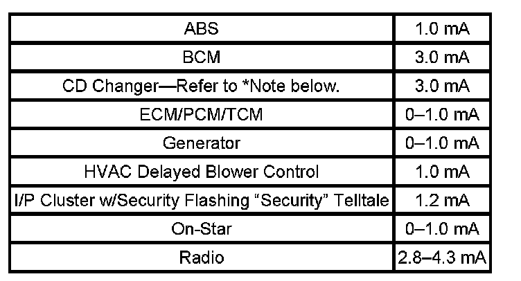 If the CD changer door is open and the light is illuminated, the parasitic current draw will be approximately 65 mA. The light will remain ON for 2 minutes. After the light goes out, the CD changer parasitic current draw will stabilize at approximately 3 mA. Electrical Drain/Parasitic Load Test
