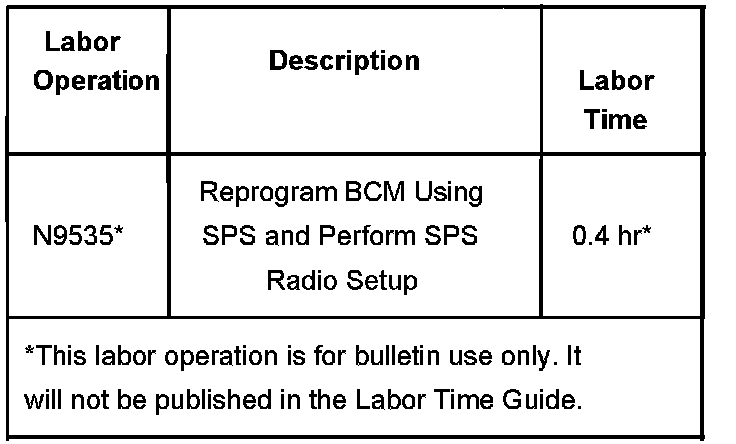 On affected vehicles, perform body control module (BCM) reprogramming using the Service Programming System (SPS) (also referenced as the Saturn Service Stall system). The new software will allow the interior instrument panel lights to stay off along while keeping the radio display at full intensity when the "ambient light sensor" informs the BCM that it is still light outside - even though the headlights have been turned on manually or been commanded on when the wipers are engaged. It is important to also reconfigure the radio using SPS after the BCM has been reprogrammed.