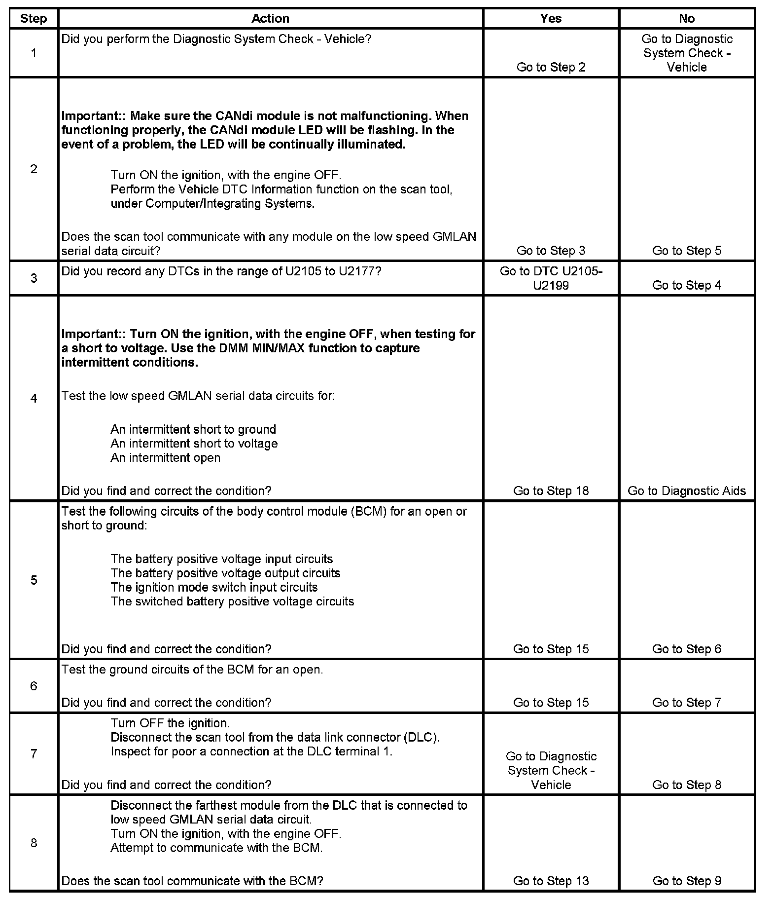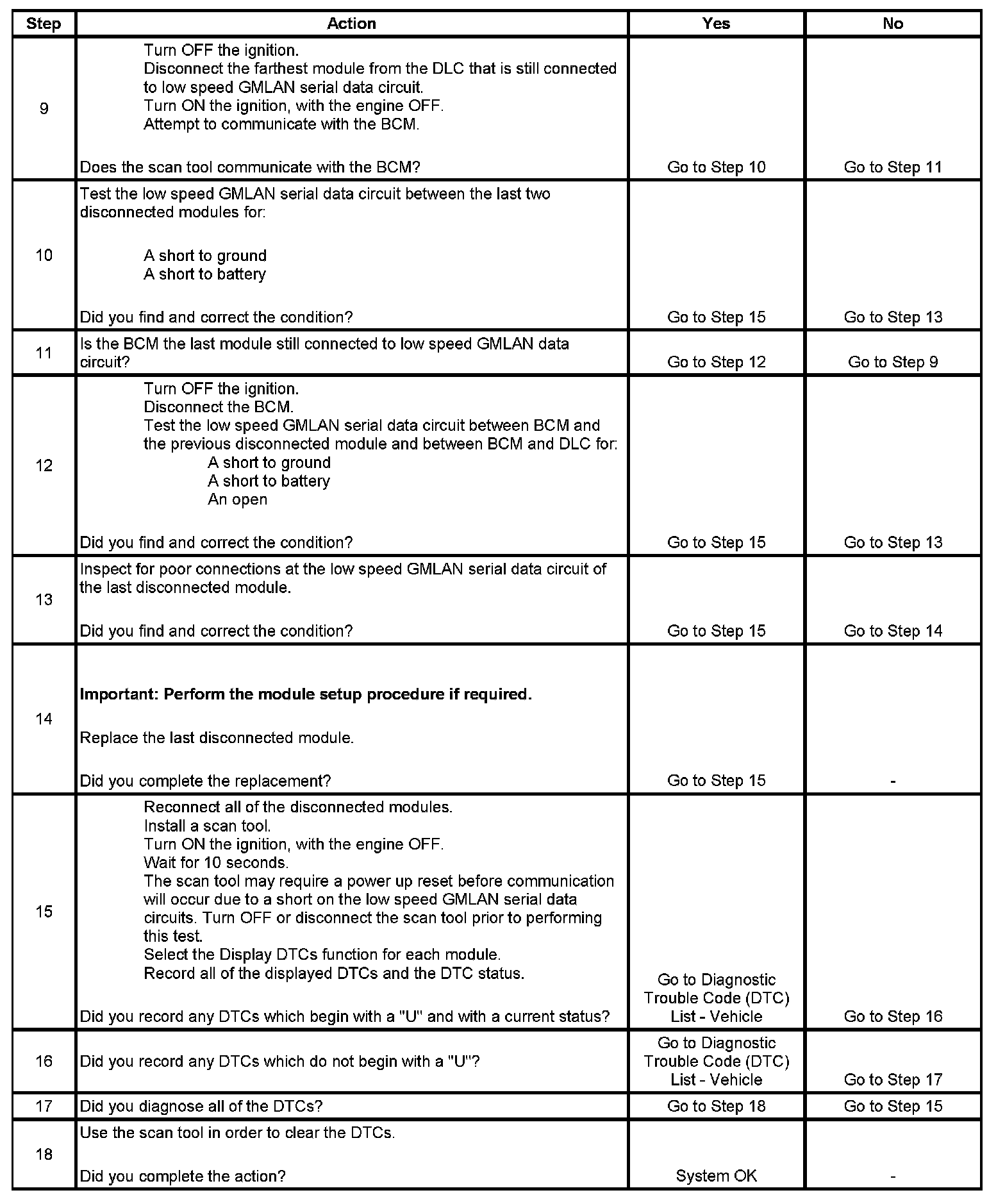 2. A partial malfunction in the low speed GMLAN serial data circuits uses a different procedure from a total malfunction of the low speed GMLAN data circuits. Refer to Data Link References to identify which modules communicate on the low speed GMLAN serial data circuits. Initial Inspection and Diagnostic Overview