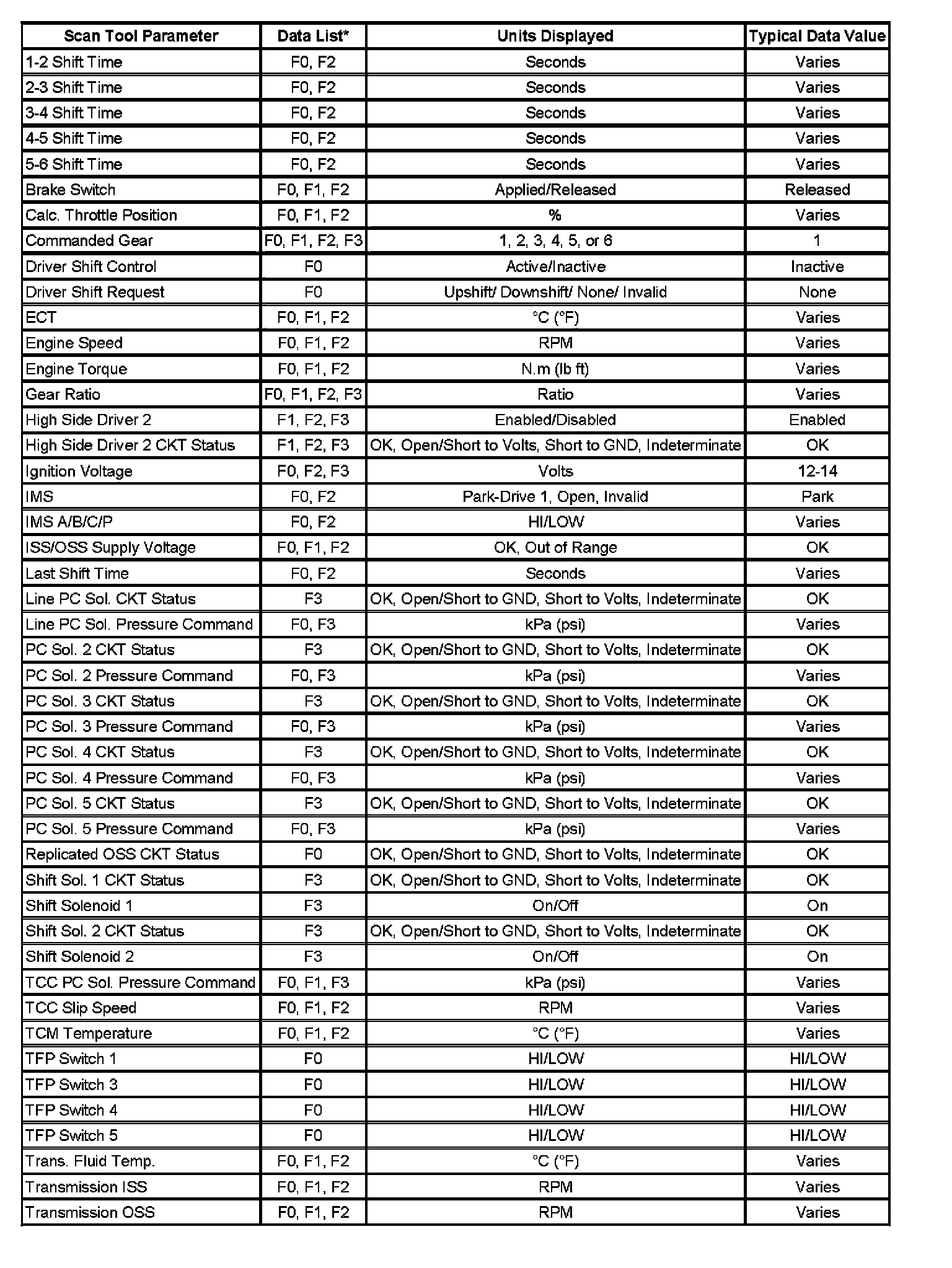 Only the parameters listed below are used in this manual for diagnosing. If a scan tool displays other parameters, the values are not recommended by General Motors for use in diagnosis.