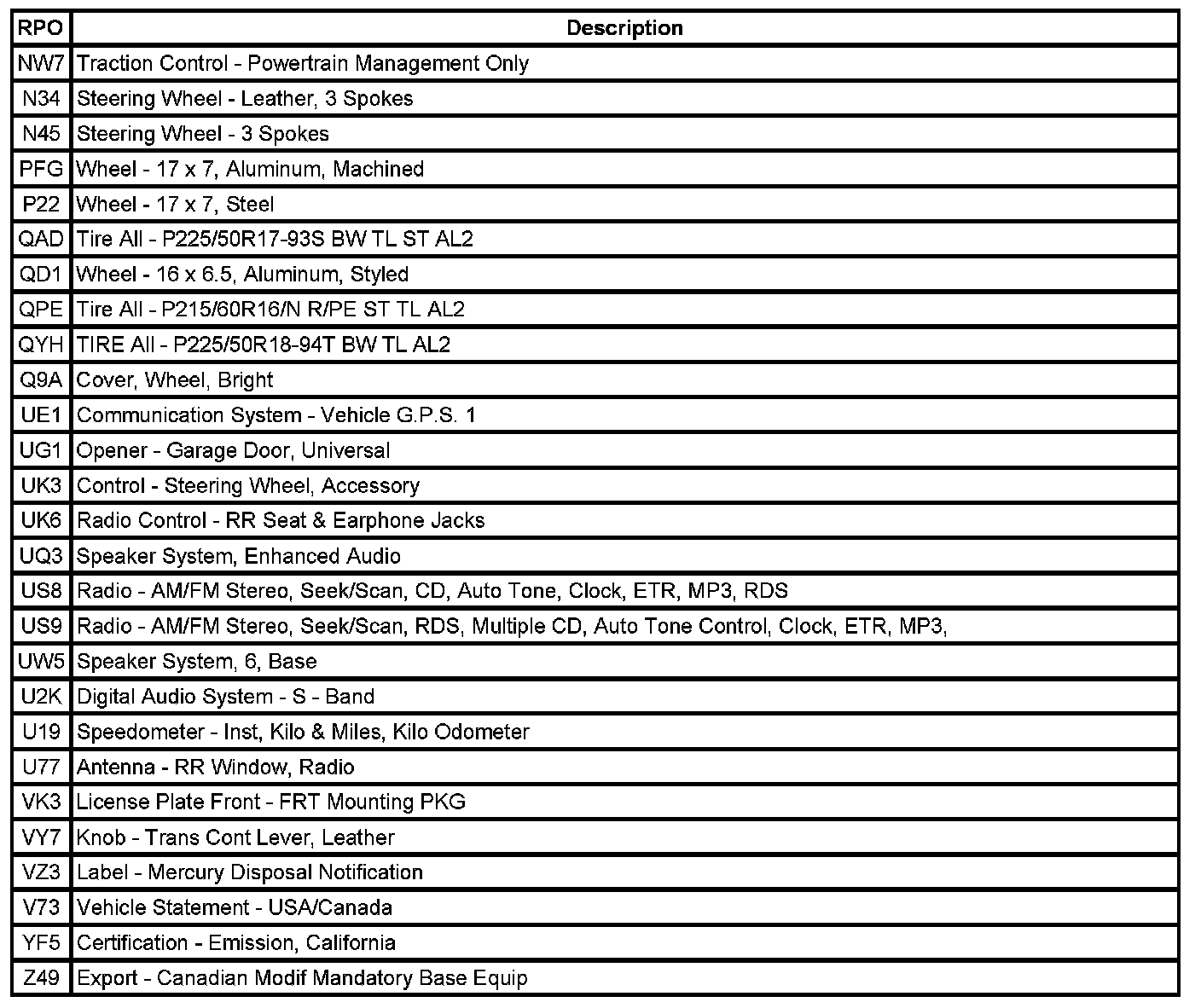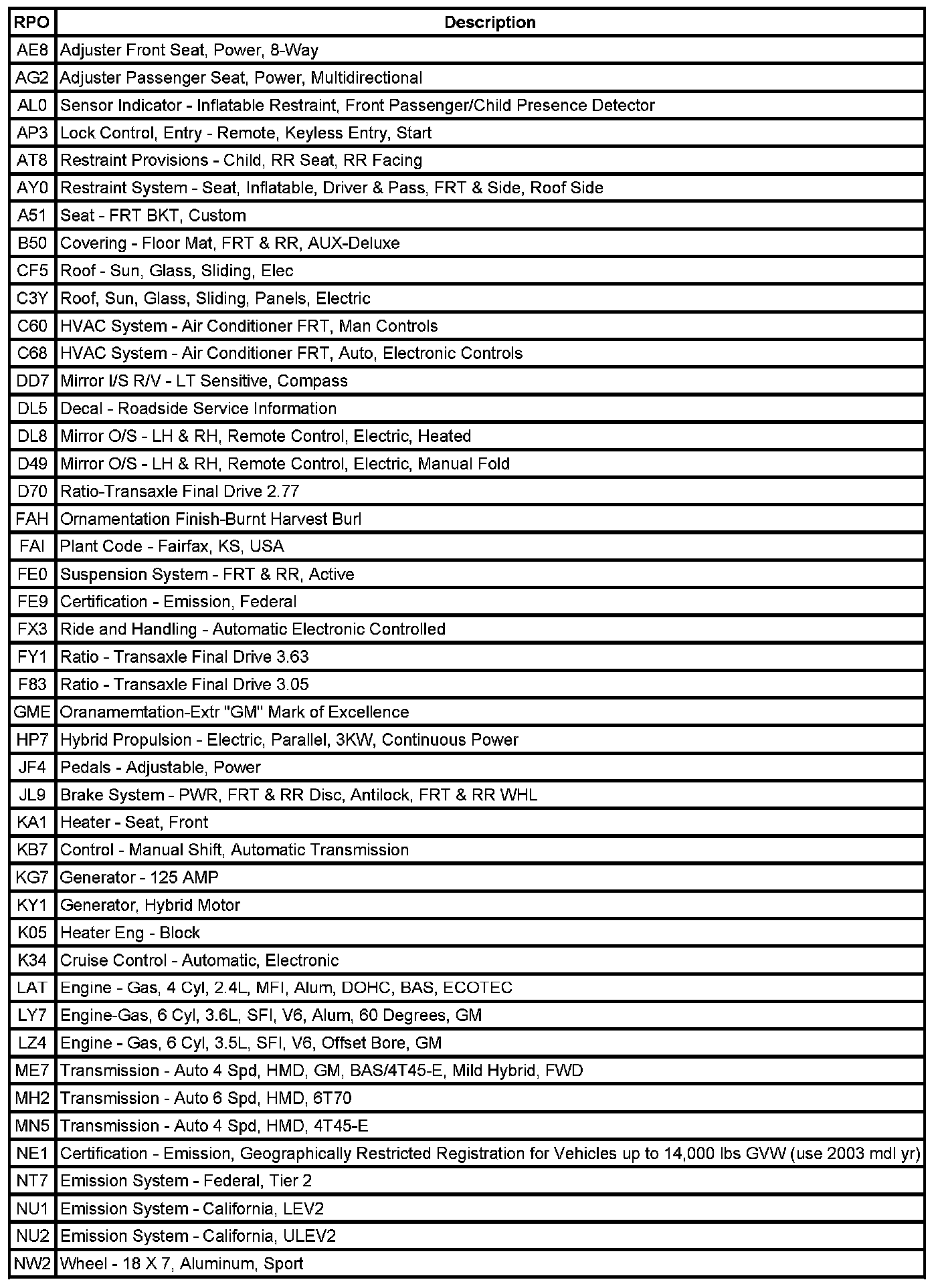 The following table provides the description of the Regular Production Option (RPO) codes that are available on the vehicle. The vehicle's RPO list is printed on the Service Parts Identification Label.