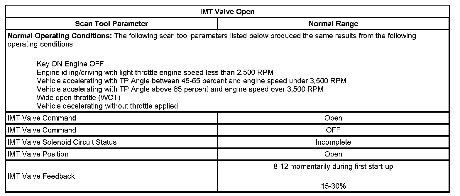 The intake manifold tuning (IMT) valve system uses variable air induction tuning in order to achieve maximum performance and efficiency over the entire operating range of the engine. The characteristic torque curve of a normally aspirated engine depends mainly on how the engines average pressure changes over the engine speed range. The average pressure is proportional to the volume of the air mass present in the cylinder when the inlet valve is closed. The design of the inlet system determines how large an air mass can be drawn into a cylinder at a given engine speed. An IMT valve is used to change the intake manifold plenum configuration. When the IMT valve is open, the intake manifold is configured to one large plenum. When the IMT valve is closed, the intake manifold is configured to 2 smaller plenums. The 2 intake manifold plenum sizes result in different torque curves, which improves performance at low and high engine speeds. During low speed, high load conditions the IMT valve is closed creating a longer runner path inside the plenum, which increases torque. During higher engine speeds and loads, the IMT valve opens creating a shorter runner path inside the plenum, which increases horsepower.