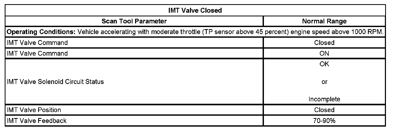 When the IMT valve is rotated the hall-effect sensor is reporting the position of the valve to the engine control module (ECM). The control module uses this feedback signal to determine the position of the IMT valve. The IMT Valve Signal circuit is supplied to the IMT Valve at terminal D