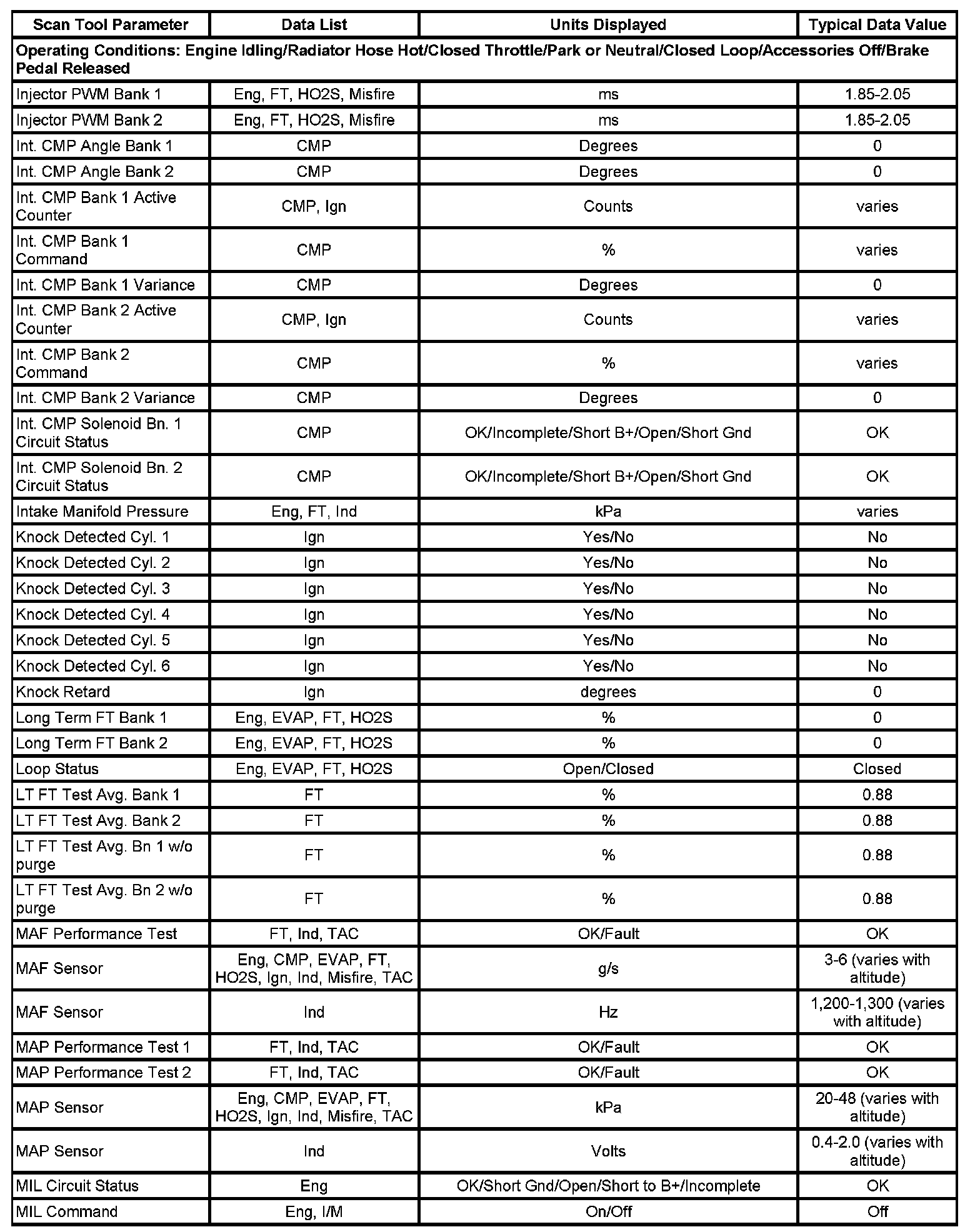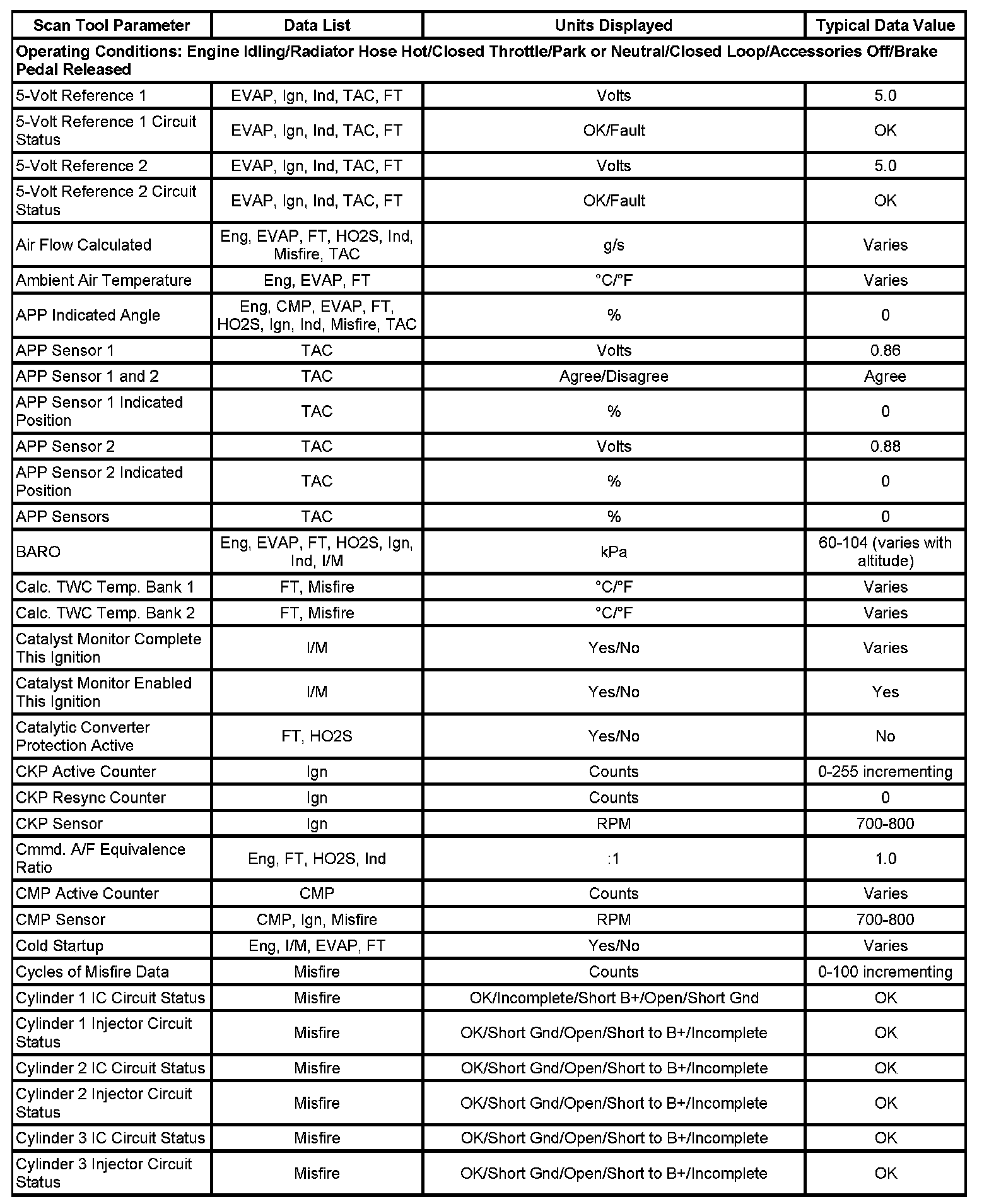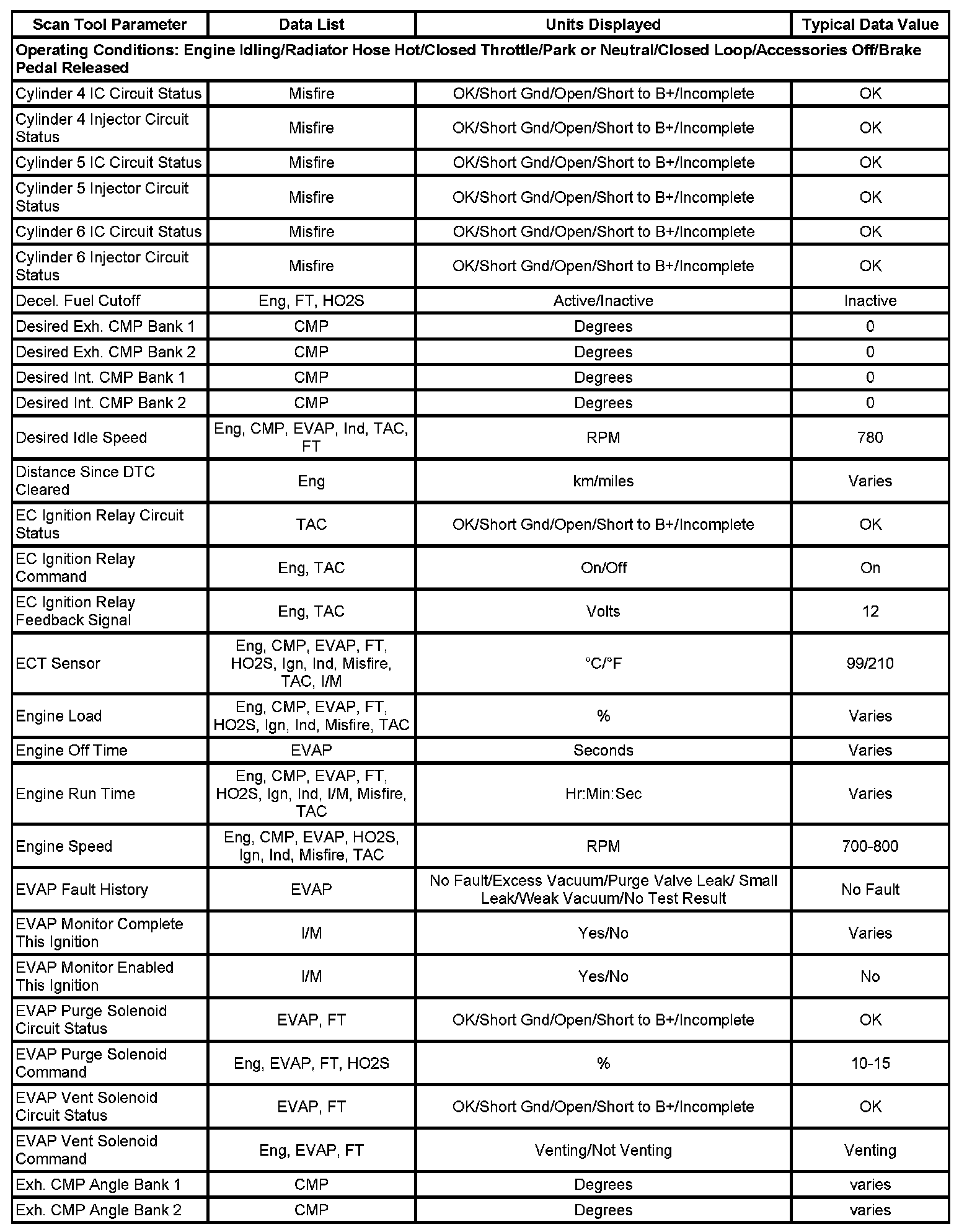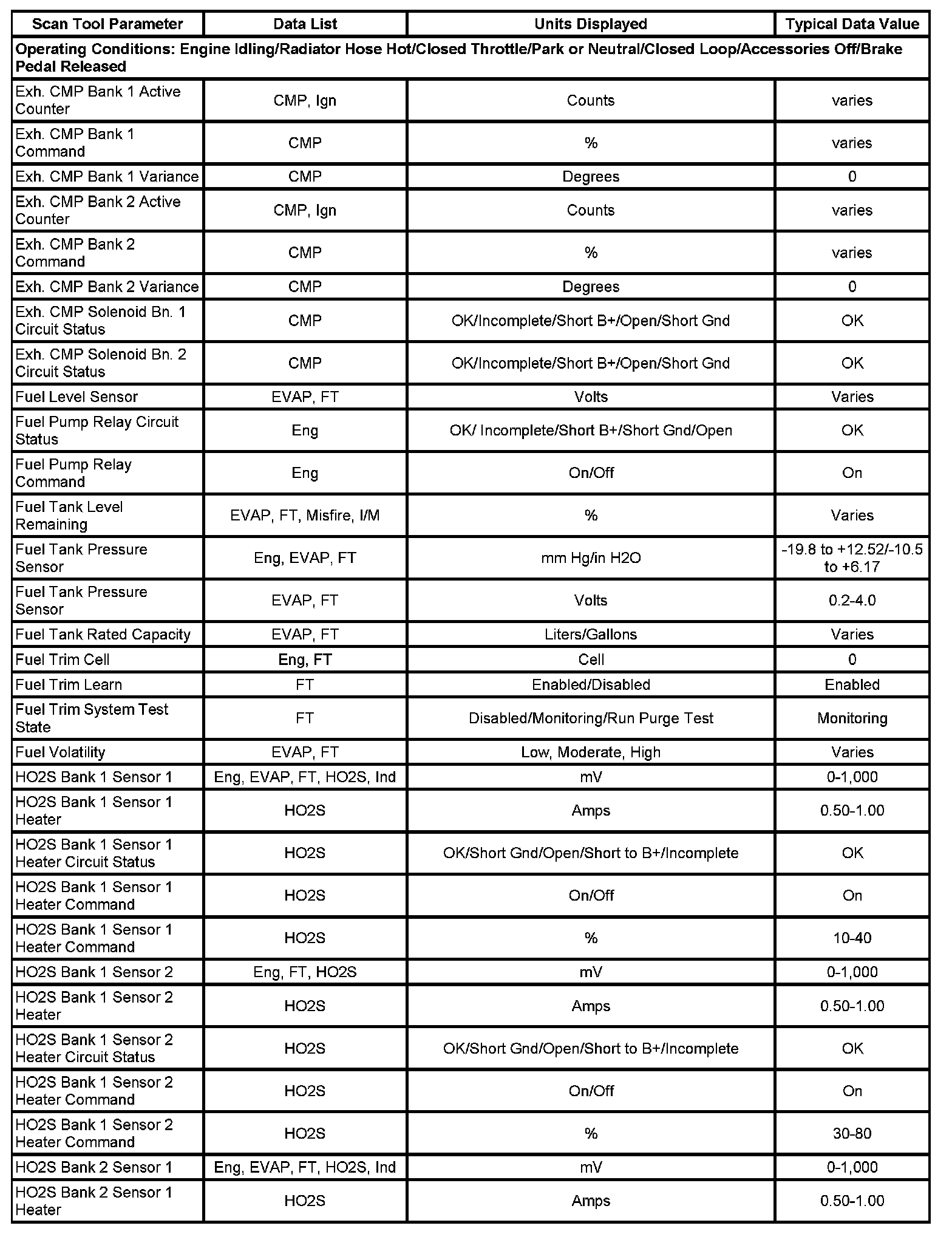 The Engine Scan Tool Data List contains all engine controls-related parameters that are available on the scan tool. The list is arranged in alphabetical order. A given parameter may appear in any one of the data lists, and in some cases may appear more than once, or in more than one data list in order to group certain related parameters together.