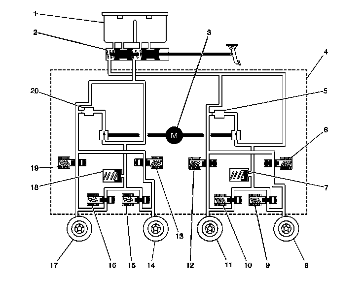 * Brake Pressure Modulator Valve (BPMV) - The BPMV contains the hydraulic valves and pump motor that are controlled electrically by the EBCM. The BPMV uses a 4 circuit configuration with a diagonal split. The BPMV directs fluid from the reservoir of the master cylinder to the left front and right rear wheels and fluid from the other reservoir to the right front and left rear wheels. The diagonal circuits are hydraulically isolated so that a leak or malfunction in one circuit will allow continued braking ability on the other.