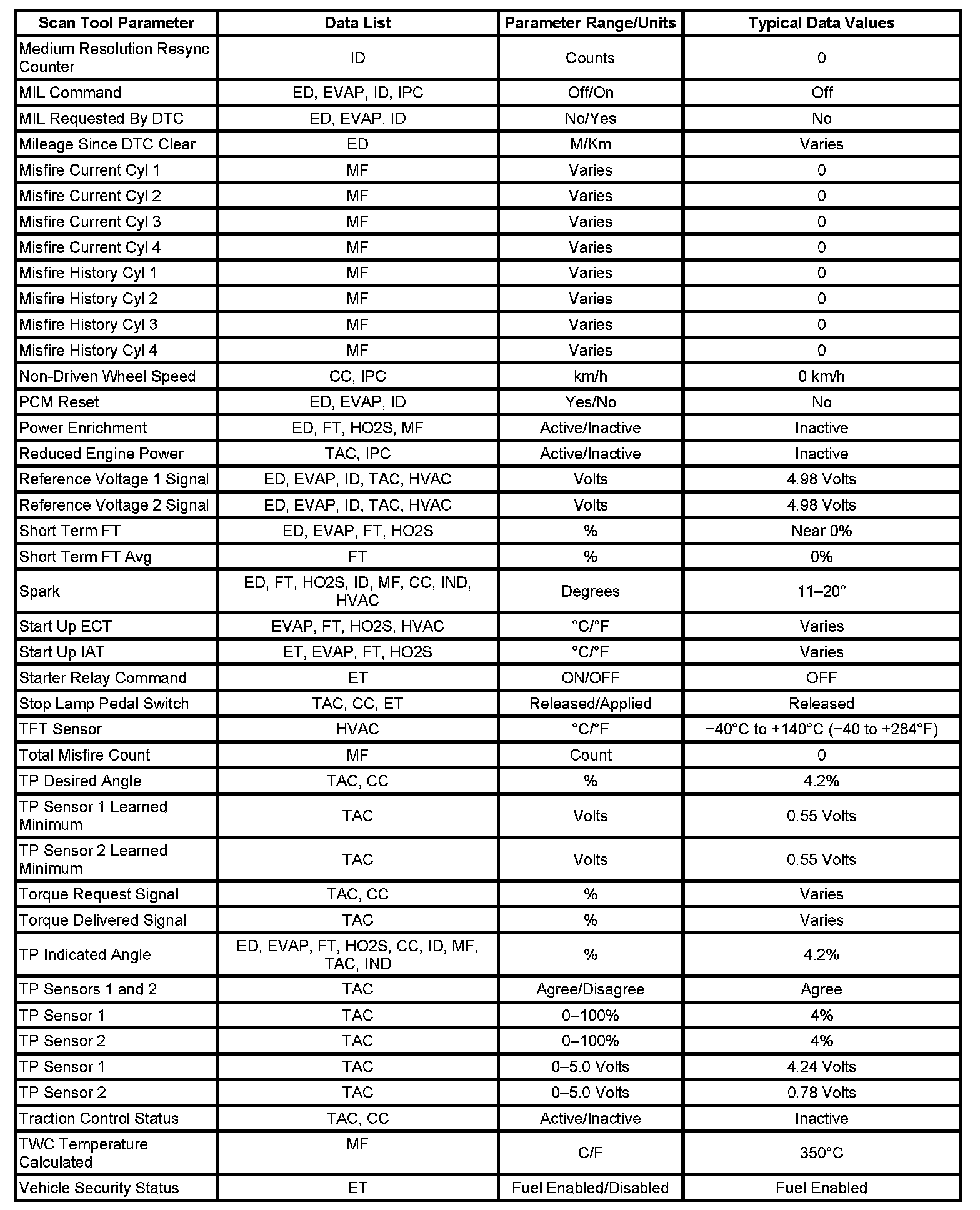 The column labeled Data List indicates where a parameter can be located on the scan tool. Refer to the scan tool operating manual for the exact locations of the data lists. The following is a description of each term listed: