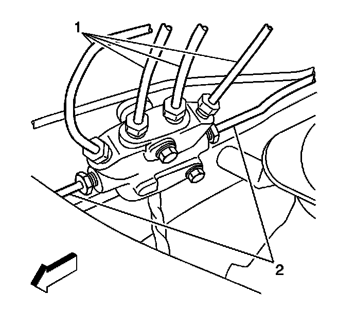 4. Disconnect the master cylinder brake pipes (2) from the proportioning valve assembly.