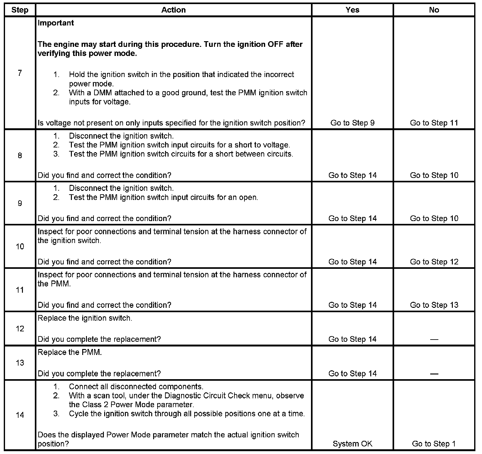 The numbers below refer to the step numbers on the diagnostic table.