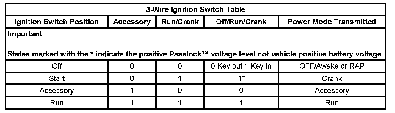 On vehicles that have several control modules connected by serial data circuits, one module is the power mode master (PMM). On this vehicle the PMM is the body control module (BCM). The PMM receives 3 discrete ignition switch signals to differentiate which power mode will be sent over the Serial Data circuits. The table illustrates the state of these inputs in correspondence to the ignition switch position: