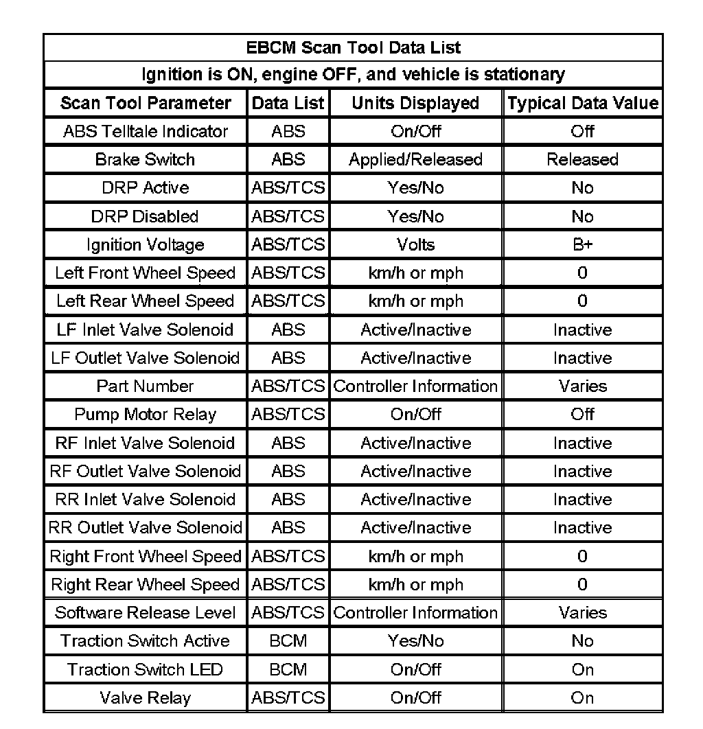 Use the EBCM Scan Tool Data Lists as directed by a diagnostic table or in order to supplement the diagnostic procedures. Begin all the diagnostic procedures with the ABS Diagnostic Starting Point. Use the EBCM Scan Tool Data Lists only after the following is determined:
