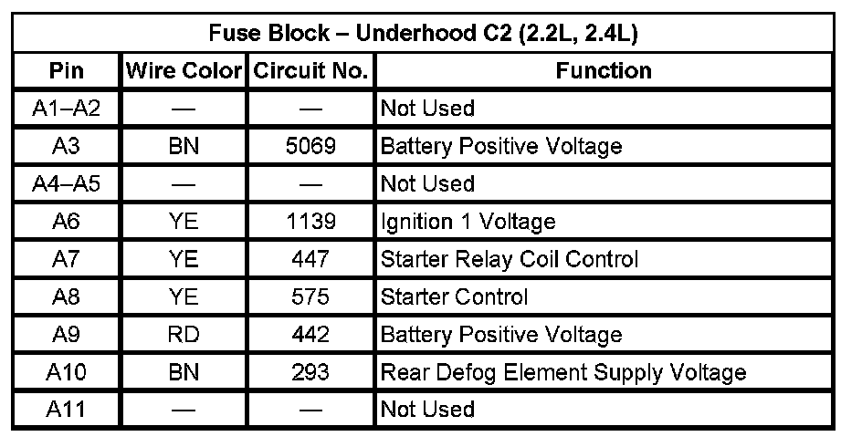 Fuse Block - Underhood C2 (Pin A1 To A11):