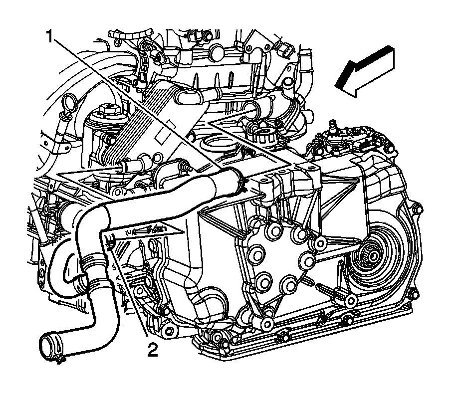 88. Position the radiator outlet hose clamp (2) at the oil cooler.