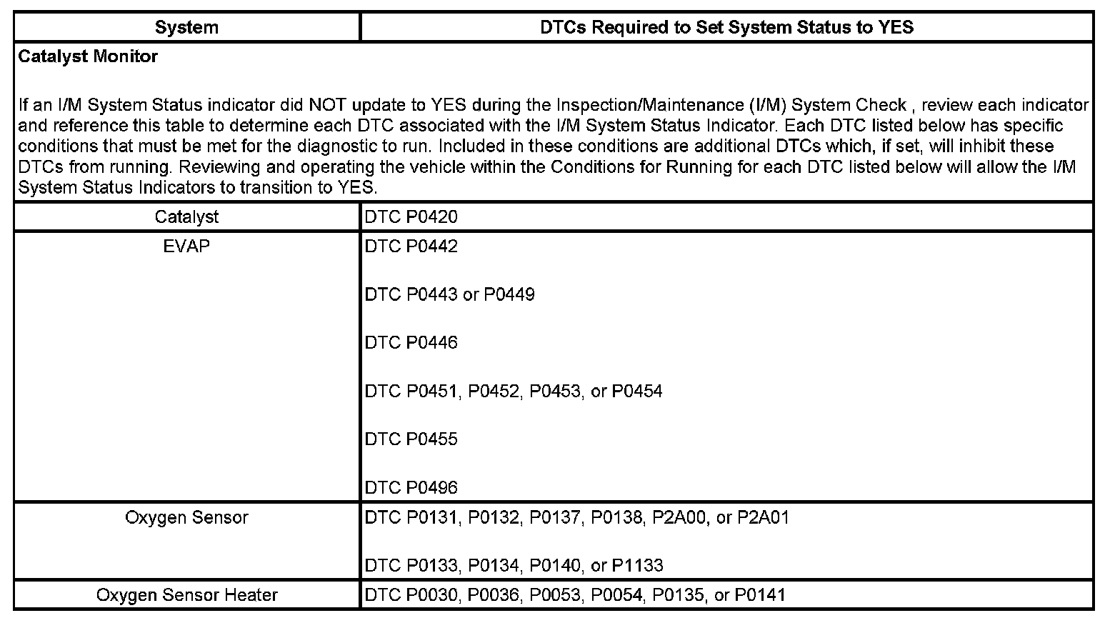 Inspection/Maintenance (I/M) System DTC Table