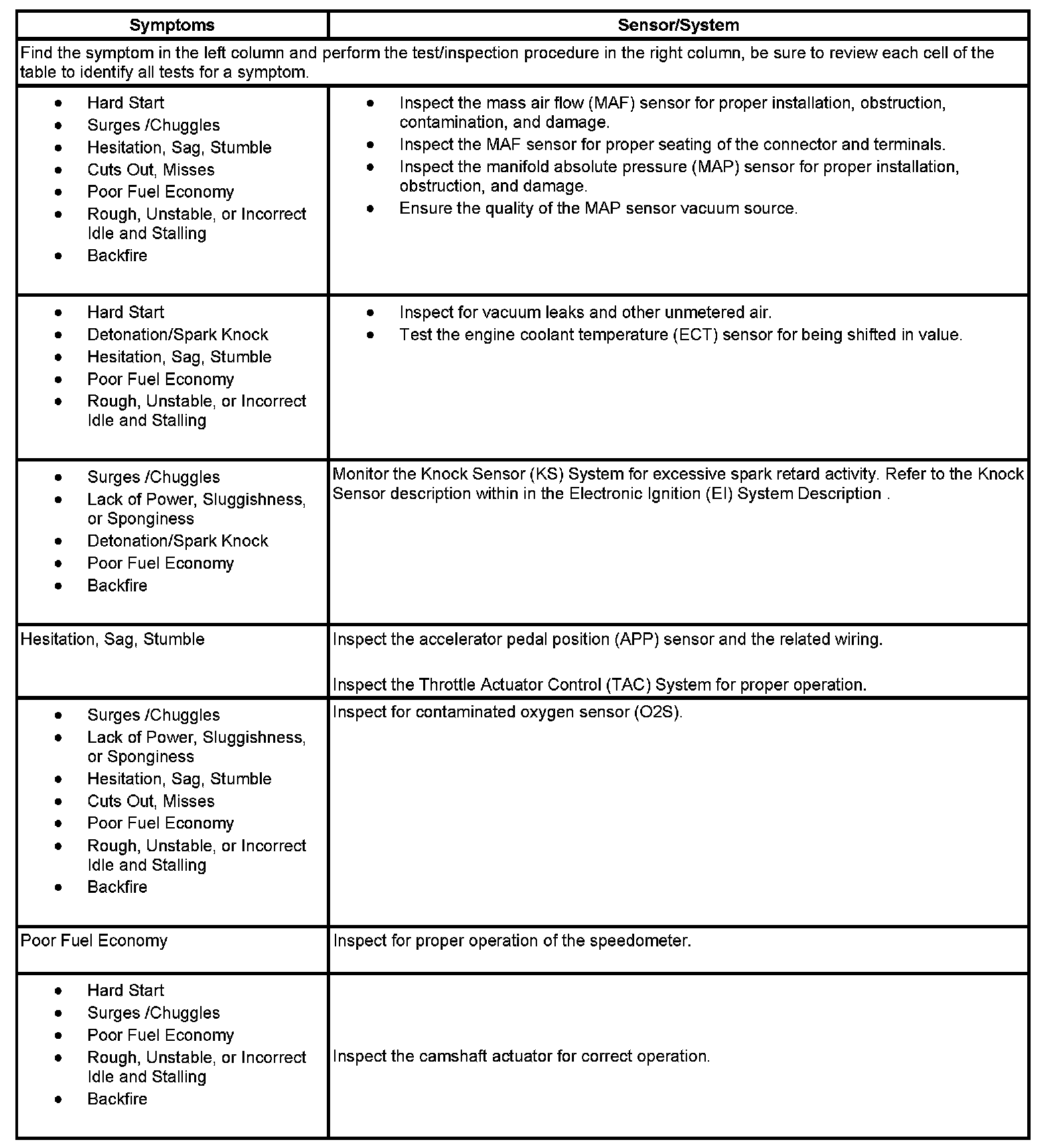 - Symptoms - Sensors/Systems