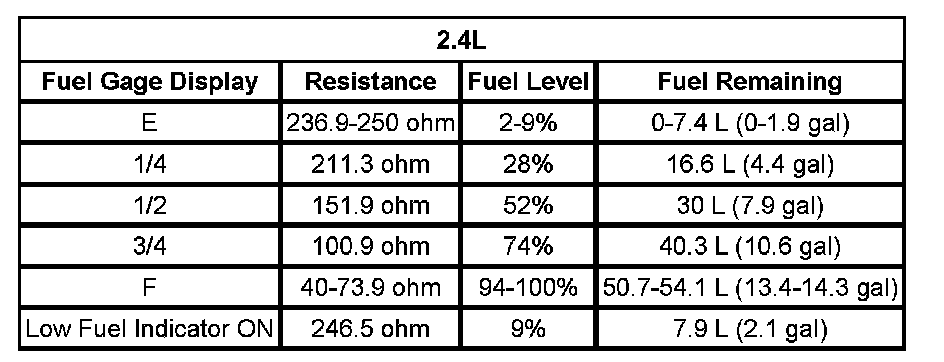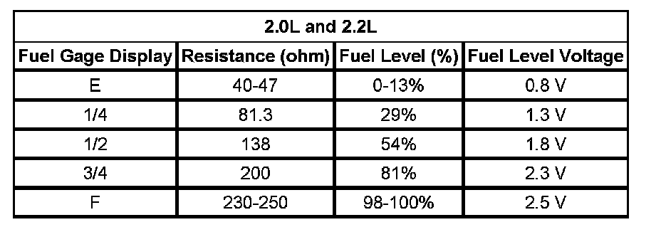 The information in this table is intended for use with the J 33431-C Signal Generator and Instrument Panel Tester. The fuel level sensor values represent the test values to be used on the Signal Generator to drive the fuel gage display to the indicated positions. Vehicles that require more than one fuel level sensor calculate gage position from many possible resistance combinations of fuel levels between the 2 tanks. Therefore, the values in the table may not correlate directly to readings taken from the vehicle primary or secondary sending units.