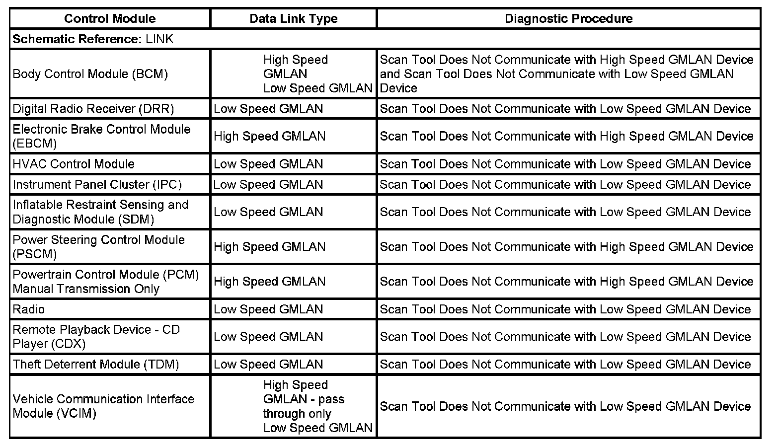 This table identifies which serial data link that a particular module uses for in-vehicle data transmission. Some modules may use more than one data link to communicate. Some modules may have multiple communication circuits passing through them without actively communicating on that data link. This table is used to assist in correcting a communication malfunction. For the description and operation of these serial data communication circuits, refer to LINK.