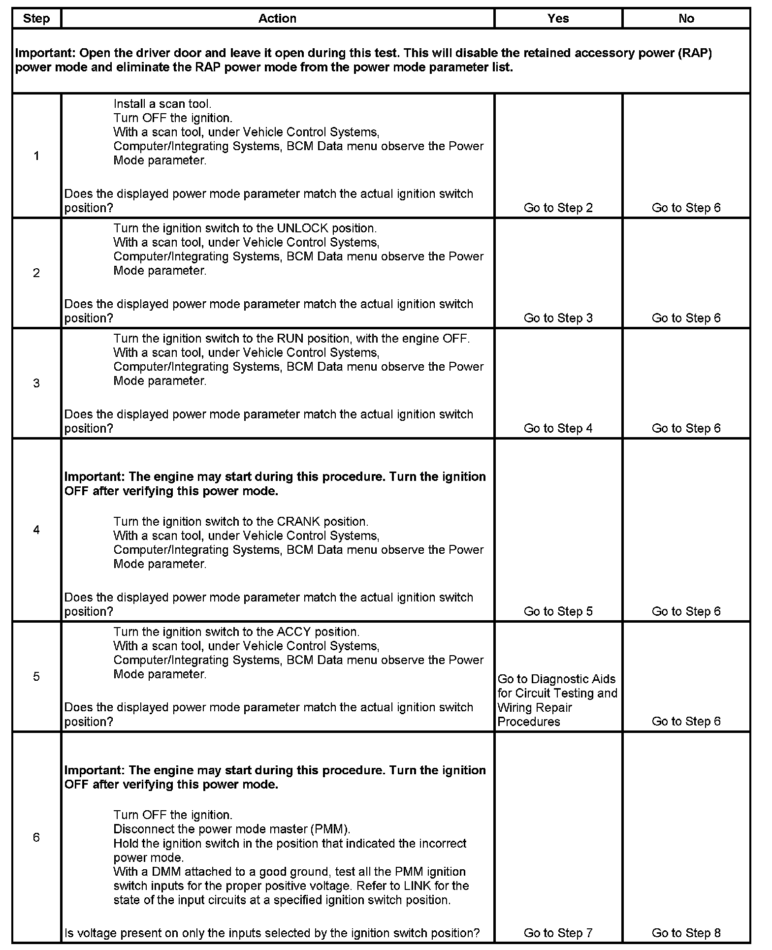 Normal vehicle serial data communications and the control modules operations will not begin until the system power mode has been identified. Discrete wires from the ignition switch contacts are monitored by a module which acts as the power mode master (PMM) in order to determine the correct power mode. The module which is the PMM communicates the system power mode to all modules on the serial data lines. Refer to LINK to identify which module is the PMM and the applicable power mode look up table.