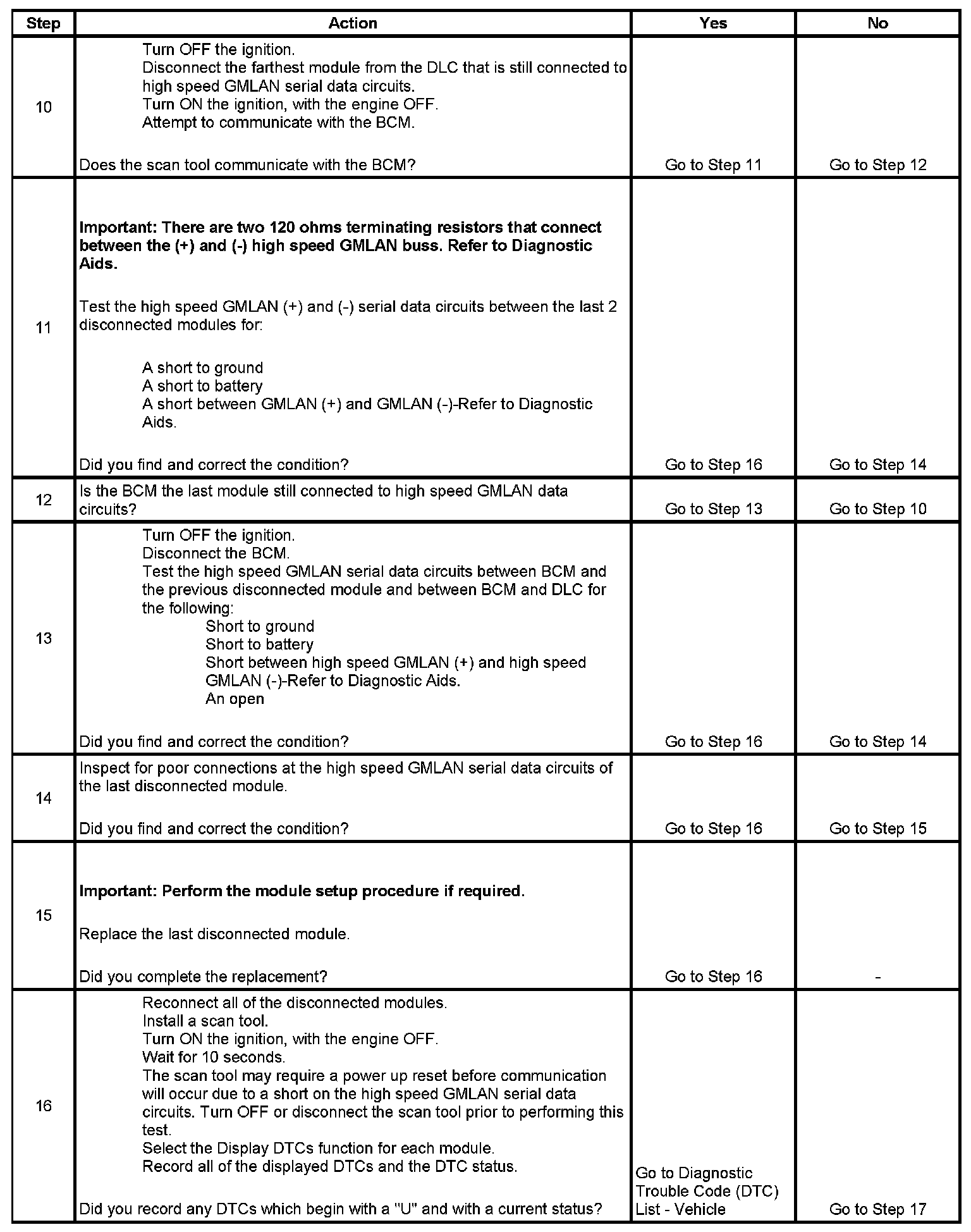 The high speed GMLAN serial data buss uses two 120 ohms terminating resistors that are in parallel with the high speed GMLAN (+) and (-) circuits. One of the resistors is connected at the data link connector (DLC) end of the link and the other is at the engine management module, engine control module (ECM) or powertrain control module (PCM), end of the link. The DLC terminating resistor resides internally in the BCM. When testing for a short between high speed GMLAN (+) and (-) with the engine management module removed, a reading off 120 ohms is normal. However, to completely analyze the buss the body control module (BCM) should be temporally removed when testing for shorts between the high speed GMLAN (+) and (-) while also making sure that all modules and the scan tool are disconnected from the buss. A normal reading across the high speed GMLAN buss with the terminating resistor at the DLC remove and all module and scan tool disconnected is infinite ohms. Make certain to reconnect the BCM after testing, it is necessary for proper vehicle powermoding.