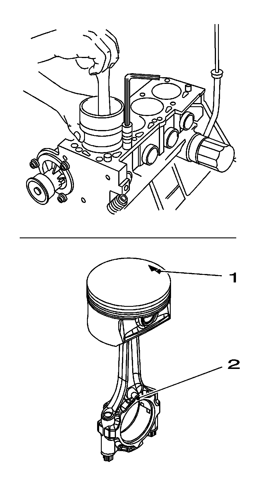 Important: Arrow (1) on piston head points to engine timing side, bead (2) on con-rod points to transmission side of engine.