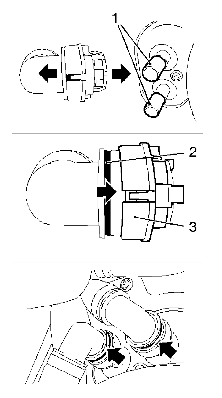 3. Install the 2 quick-release fittings on the heater core (1) connections up to the stop.