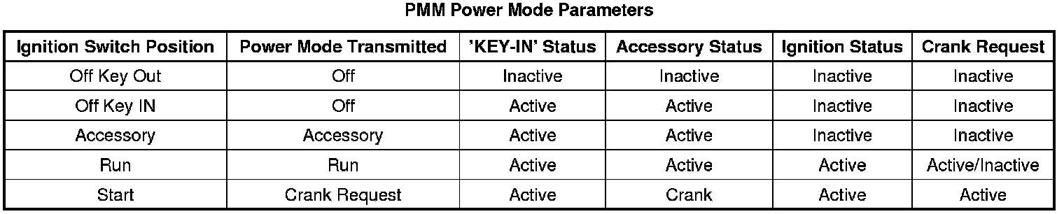 The PMM performs internal calculation based on the intergrated ignition switch to identify the current power mode state. If the SCCM determines that there is an incorrect calculation or is inable to determine the correct power mode statedDTC B2961 (B2961) will be set. The PMM Power Mode Parameters table below illustrates the correct state of these input parameters (circuits) in correspondence to the ignition switch position and can be used to aid in diagnosing power mode mismatch issues: